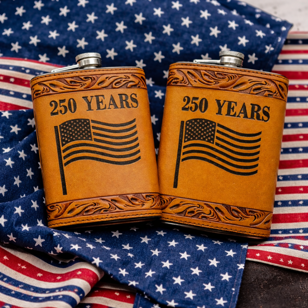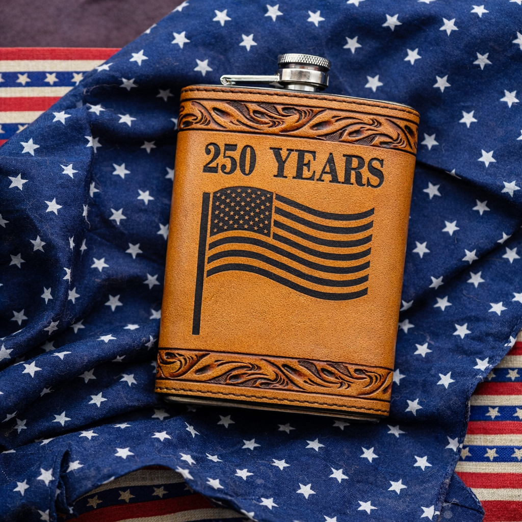 Wrapped in rich leather, the design features bold “250 YEARS” lettering above an American flag — framed by an oak leaf pattern along the top and bottom.