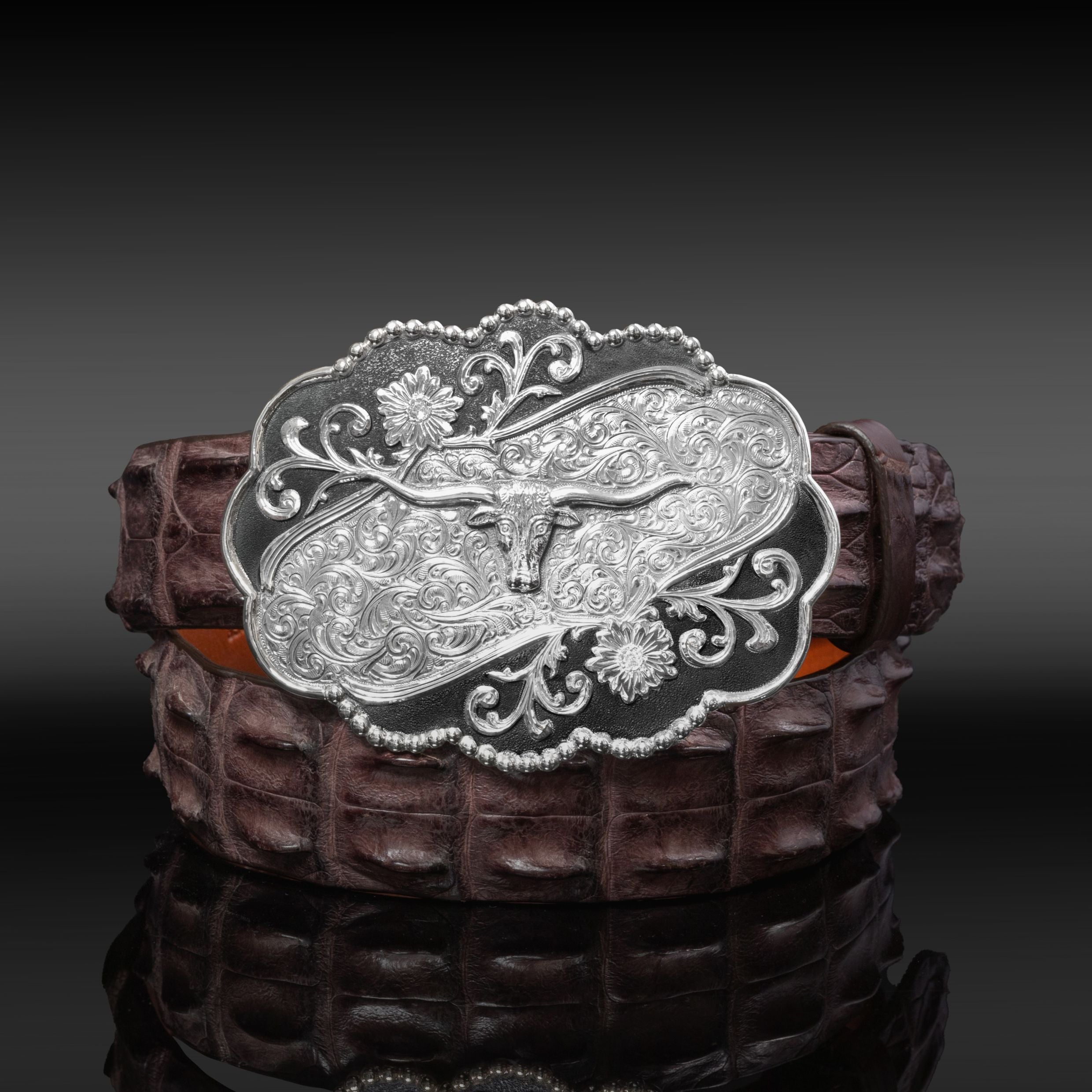 Inspired by the custom design created for Madonna's iconic Celebration Tour, this 4 ½" trophy buckle features a sterling silver base with sterling silver beads, a gold-filled half-round edge, and a 3D sterling silver longhorn centerpiece. Intricate scrolls, flowers, and oxidized details complete the fully engraved, light antique finish.