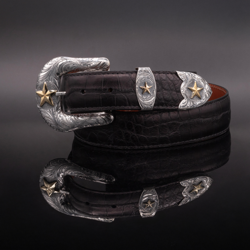 Make a statement with this fully hand-engraved, antiqued sterling silver buckle set. Featuring a slightly domed buckle shape, this buckle set is accented with three-dimensional 14-karat gold stars that are highlighted by a frosted sterling silver circle.