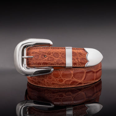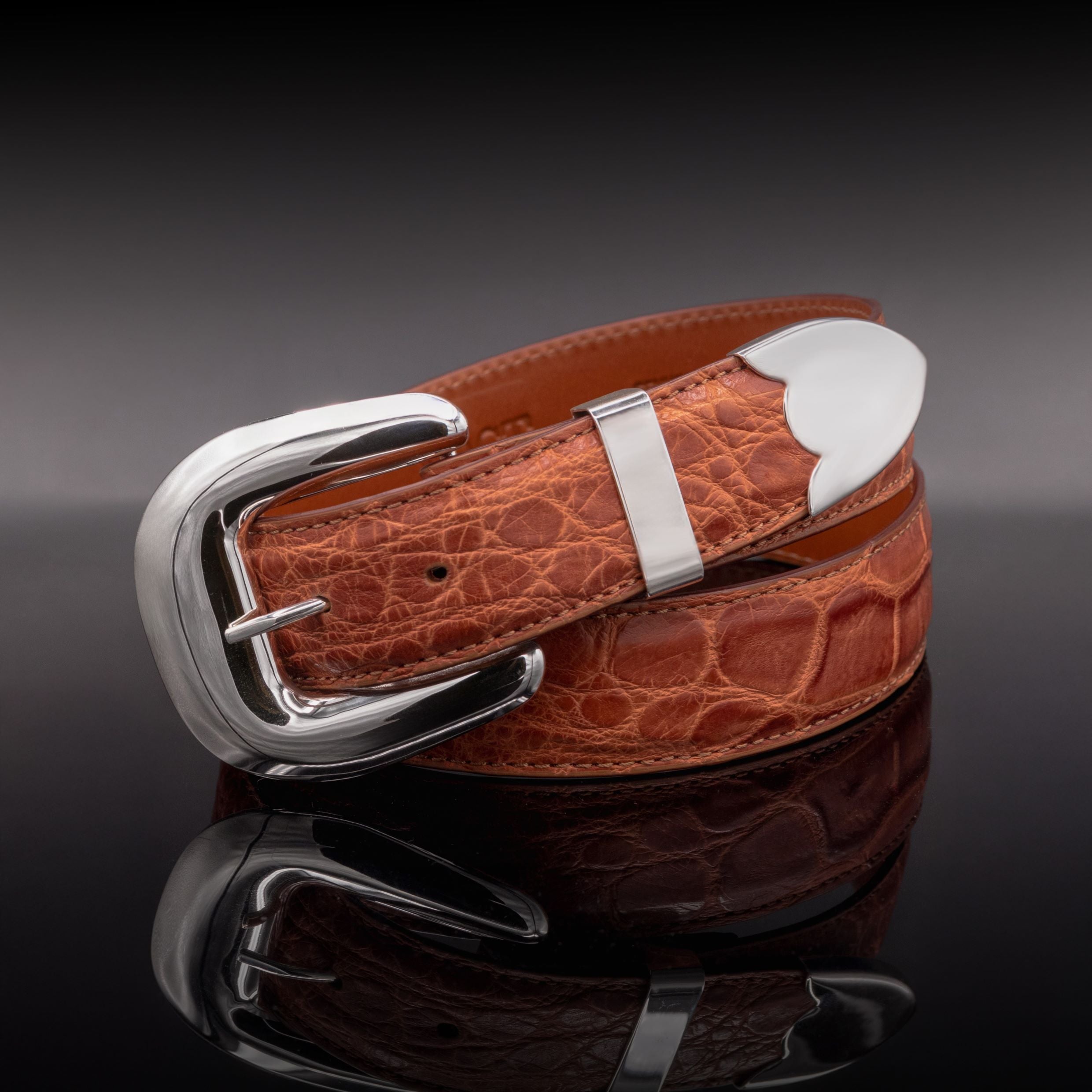 Designed with a bold, rounded silhouette, this sterling silver buckle set offers a clean, modern feel while staying true to classic Western style. The smooth, polished curves create a sleek profile that pairs effortlessly with any of our leather belts.