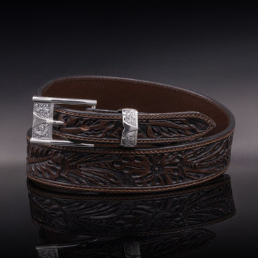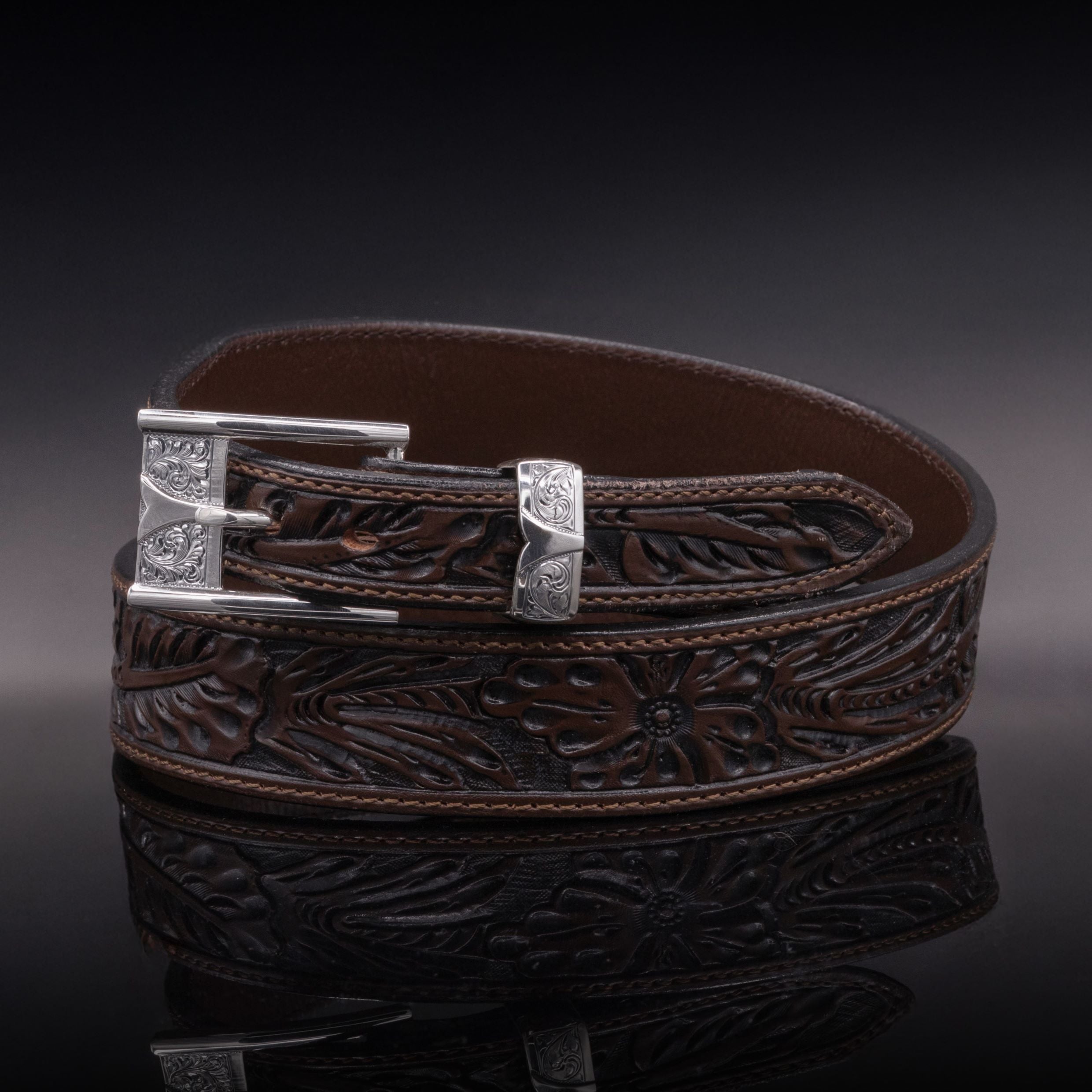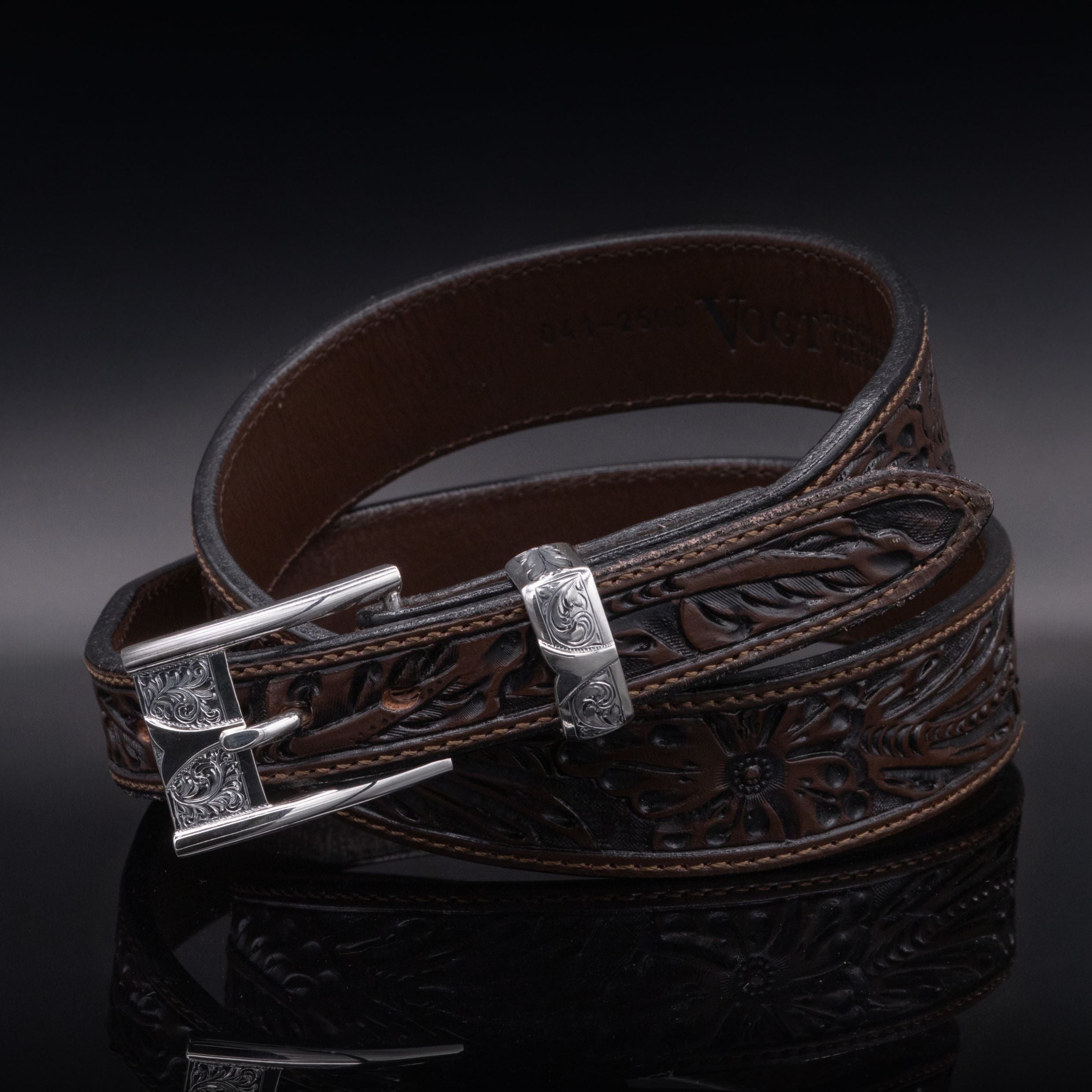Crafted from solid .925 sterling silver, this 2-piece buckle and keeper set features a sleek, rectangular shape with softened edges, designed for a refined, feminine look. Hand-engraved scrollwork covers both pieces, adding intricate detail and texture. The polished silver border contrasts beautifully with the antique finish, enhancing the depth of the design.
