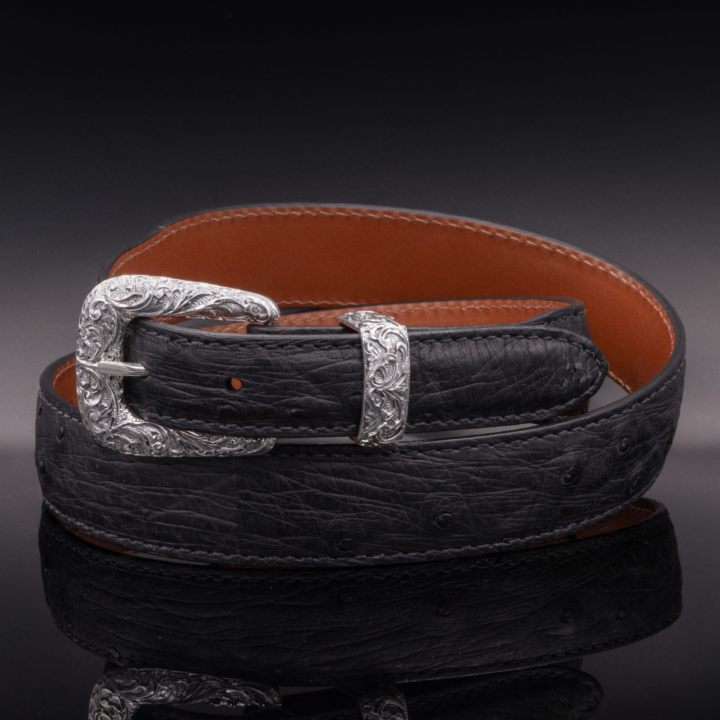 Pictured with American Ostrich in Cognac Belt , Russet Running Oak Leaf Belt.