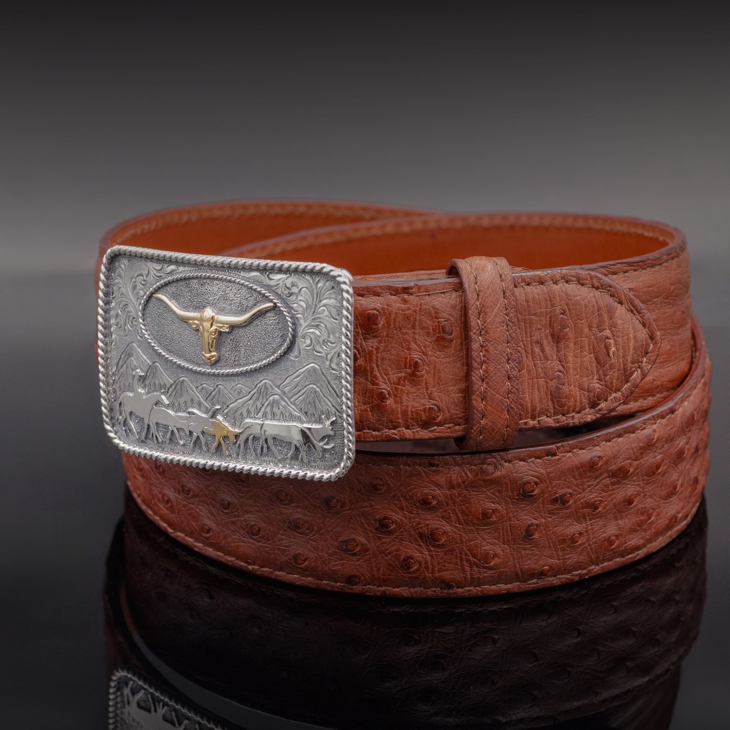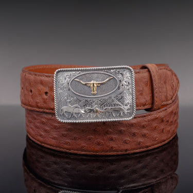 Handcrafted by Vogt Silversmiths, this buckle features a fully hand-engraved sterling silver base with a 14 karat gold longhorn centerpiece set within an oxidized oval and framed by a hand-twisted sterling rope border. A hand-cut ranch scene rests against a meticulously engraved mountain landscape, showcasing the artistry in every detail.