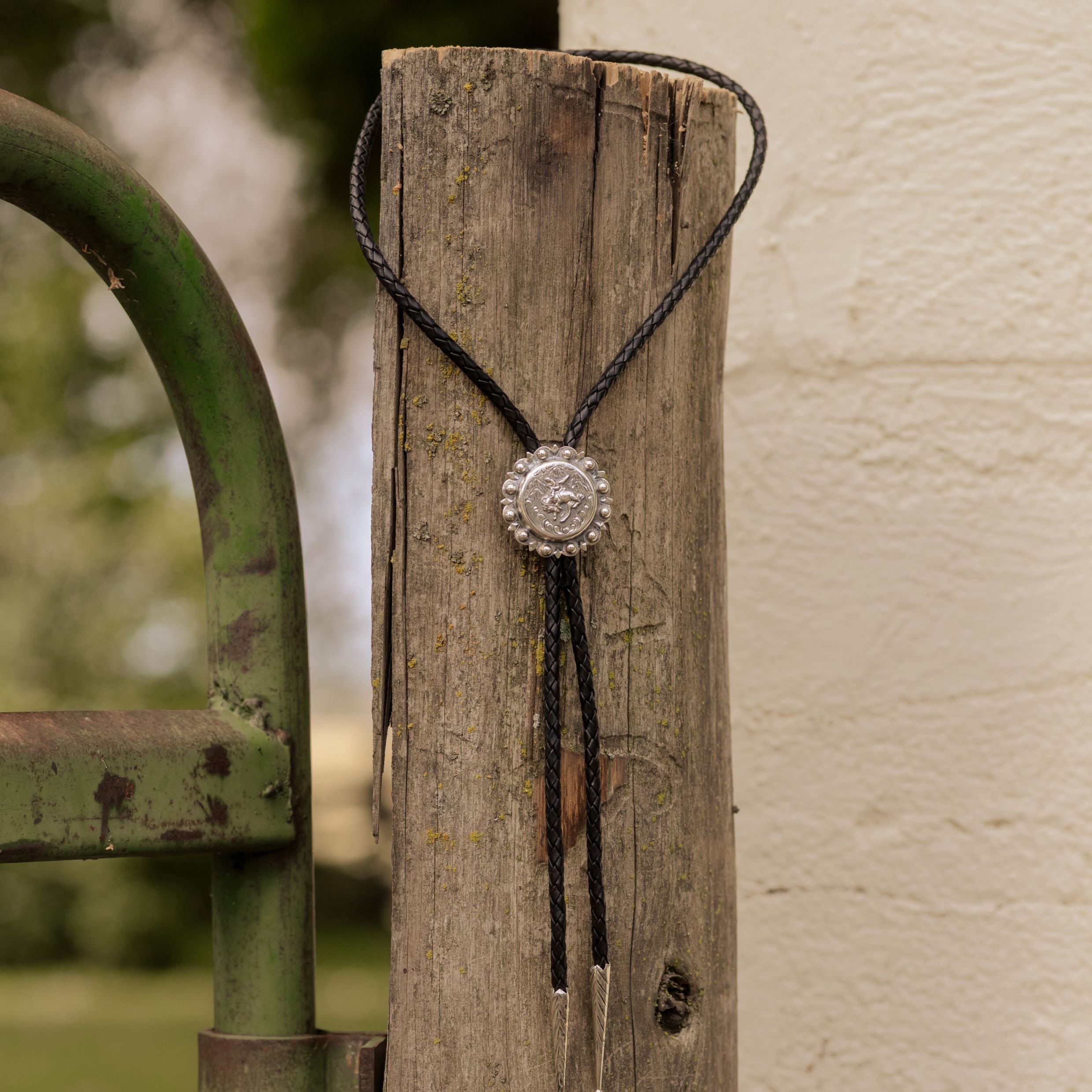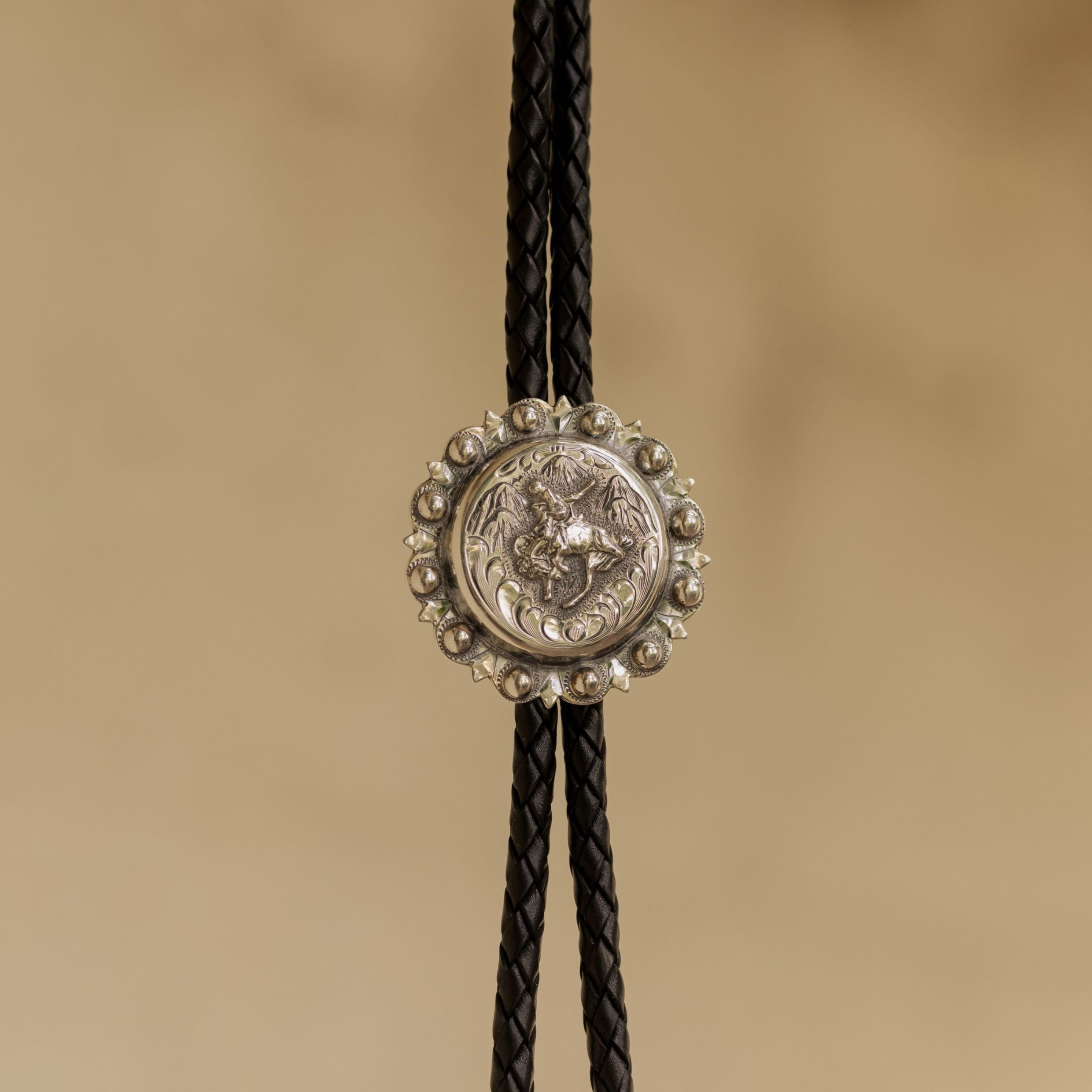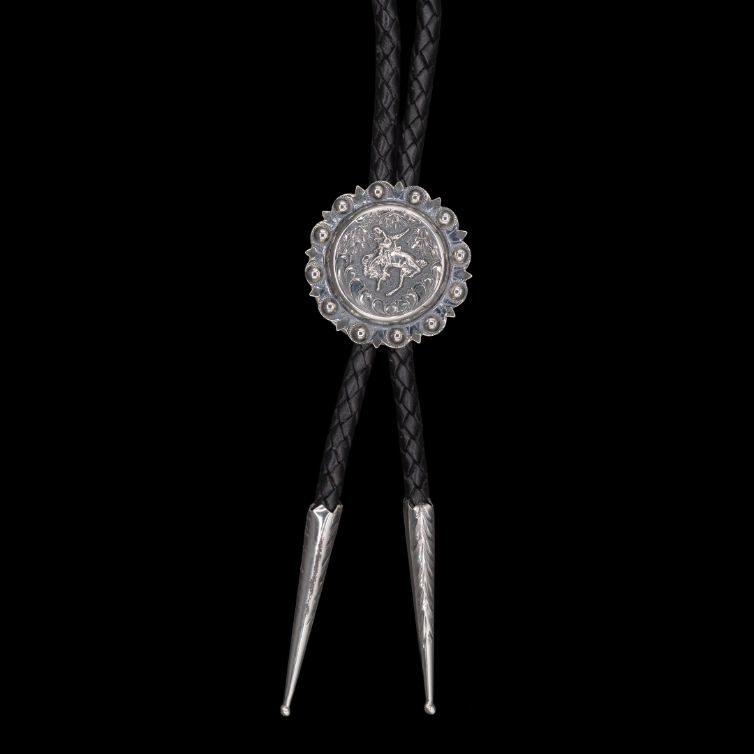 This sterling silver bolo tie features a raised bronc rider framed by hand-engraved scrollwork. Each bead along the scalloped edge is individually hand-soldered. Finished with a braided leather cord and sterling silver tips. The leather cord is available in black or brown.