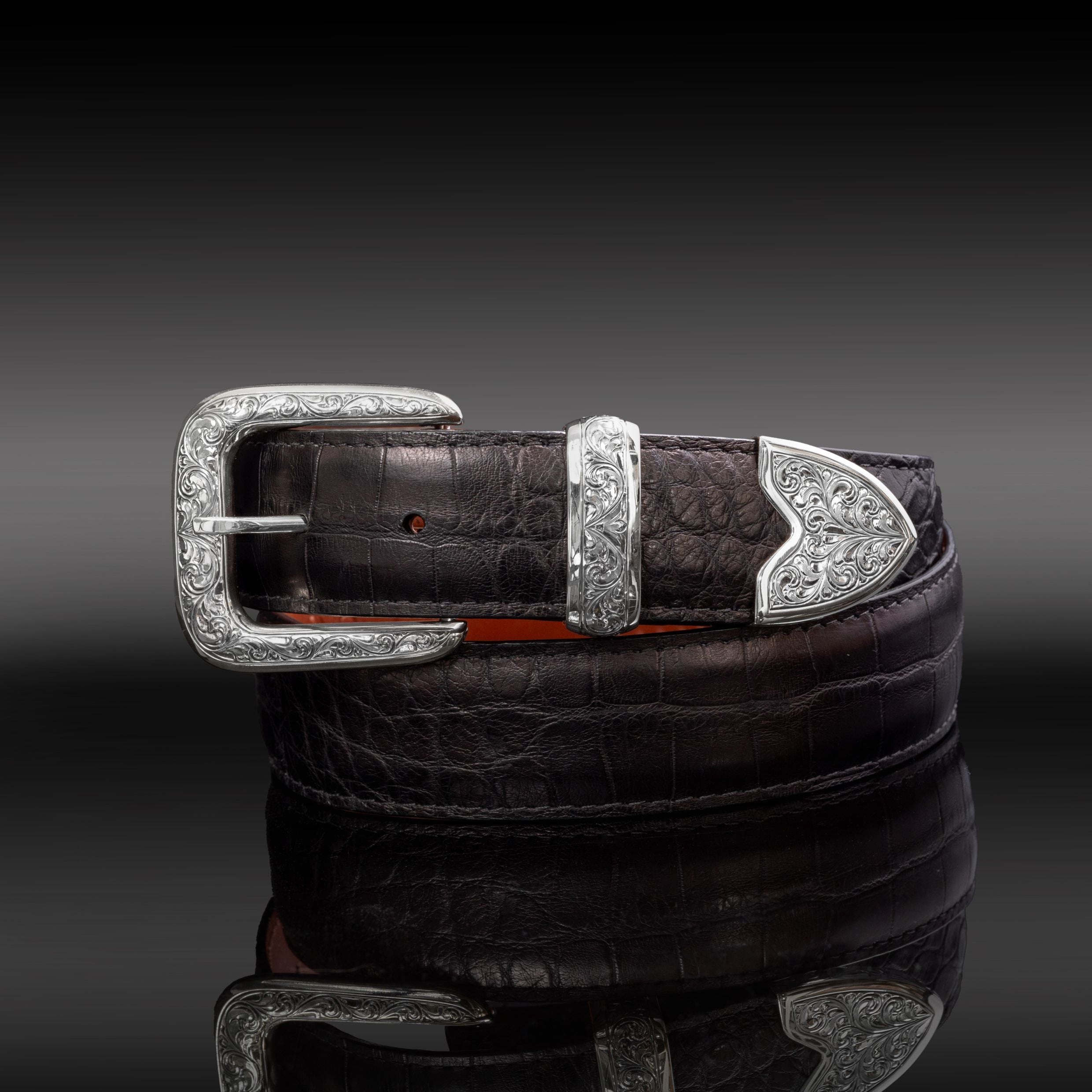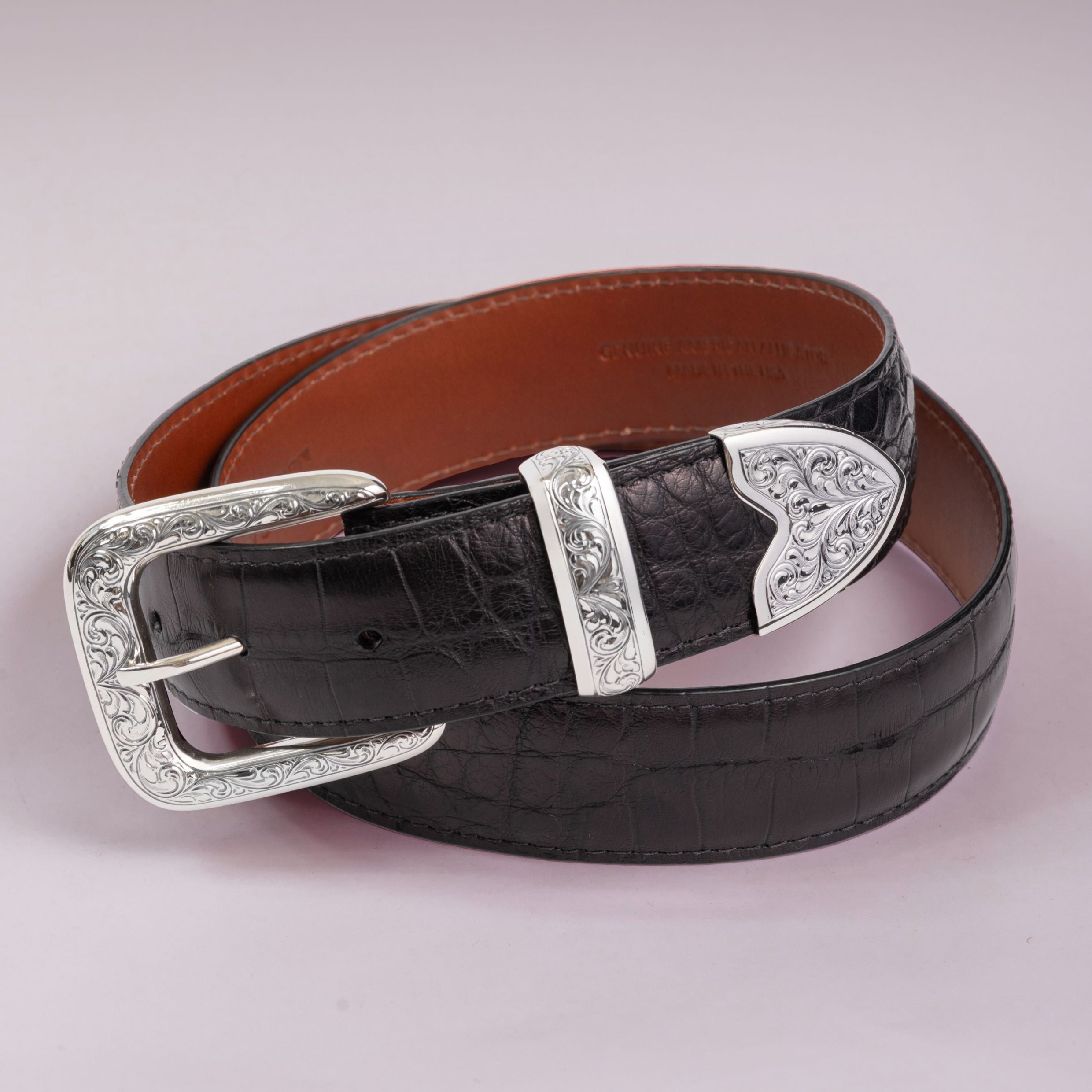 Hand-engraved scrollwork flows across the buckle, keeper, and tip of this sterling silver three-piece set. Framed by a 1/8" smooth border and finished with an antique patina. Designed to fit a 1½" belt.