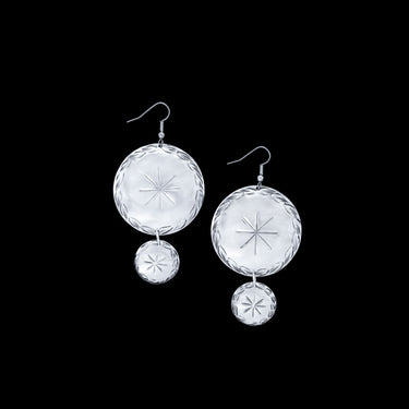 The Crystal Statement Earrings are a bold, beautiful tribute to a classic Western style. Featuring two sterling silver conchos, each hand engraved with a unique starburst accented by an etched outer edge, creating a striking, eye-catching look.