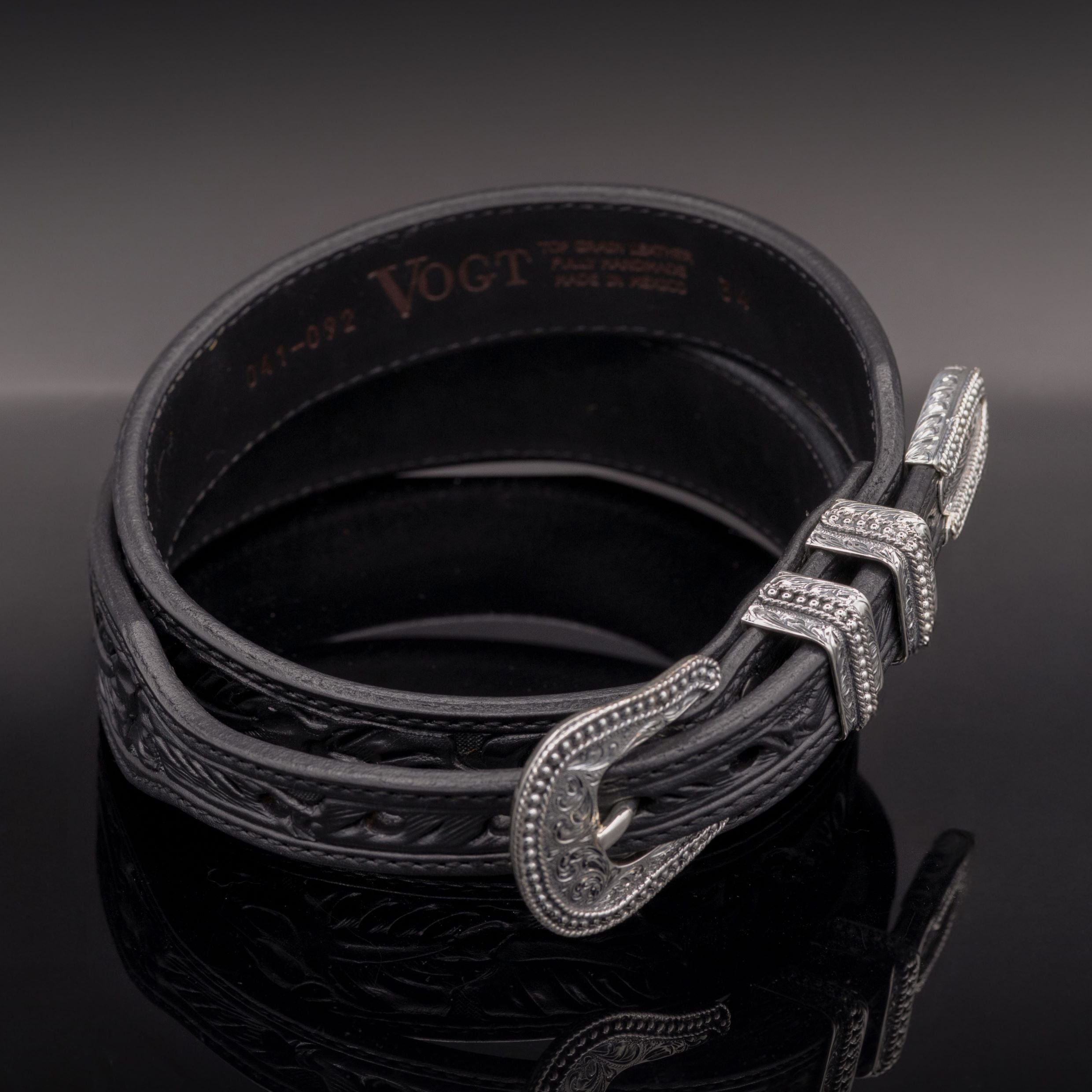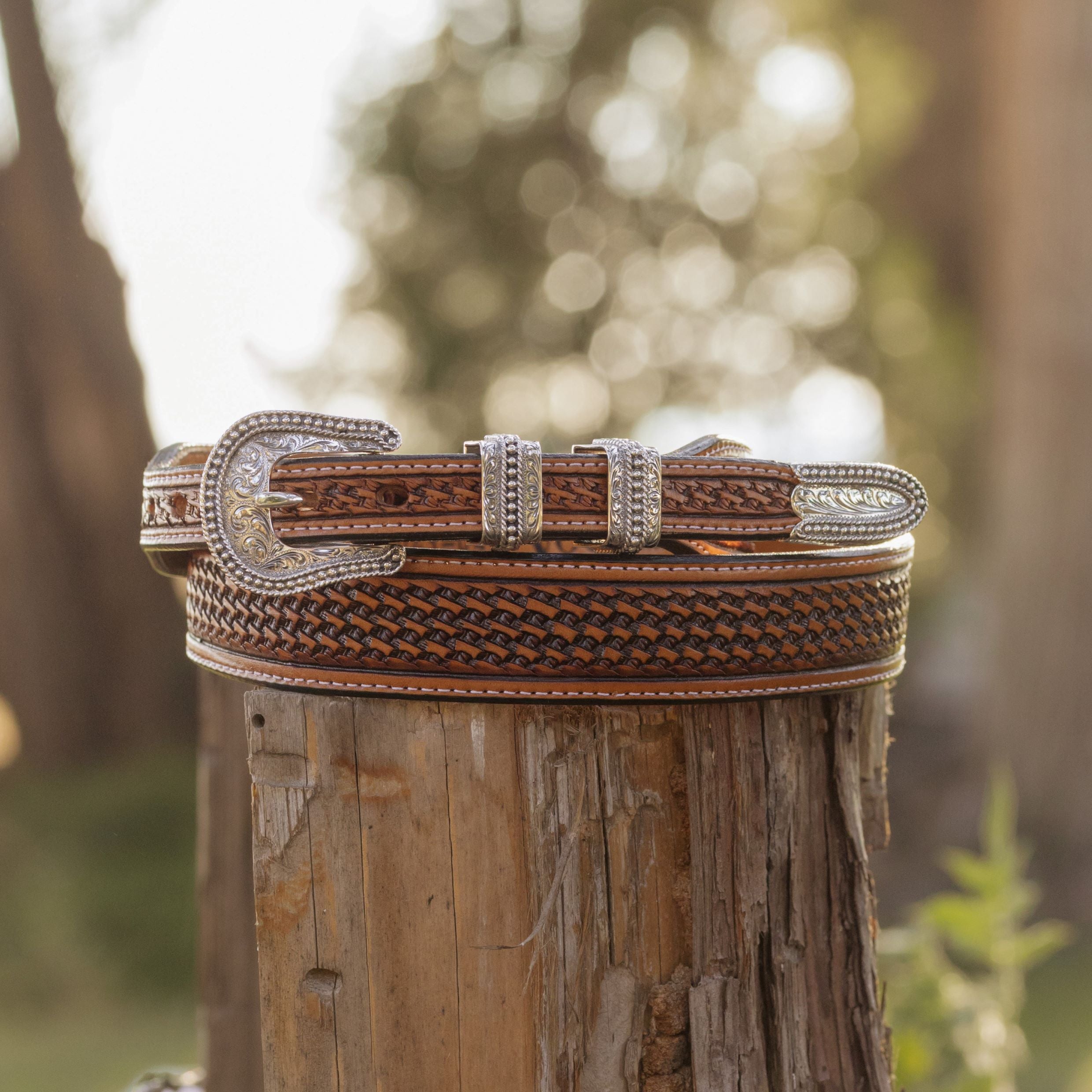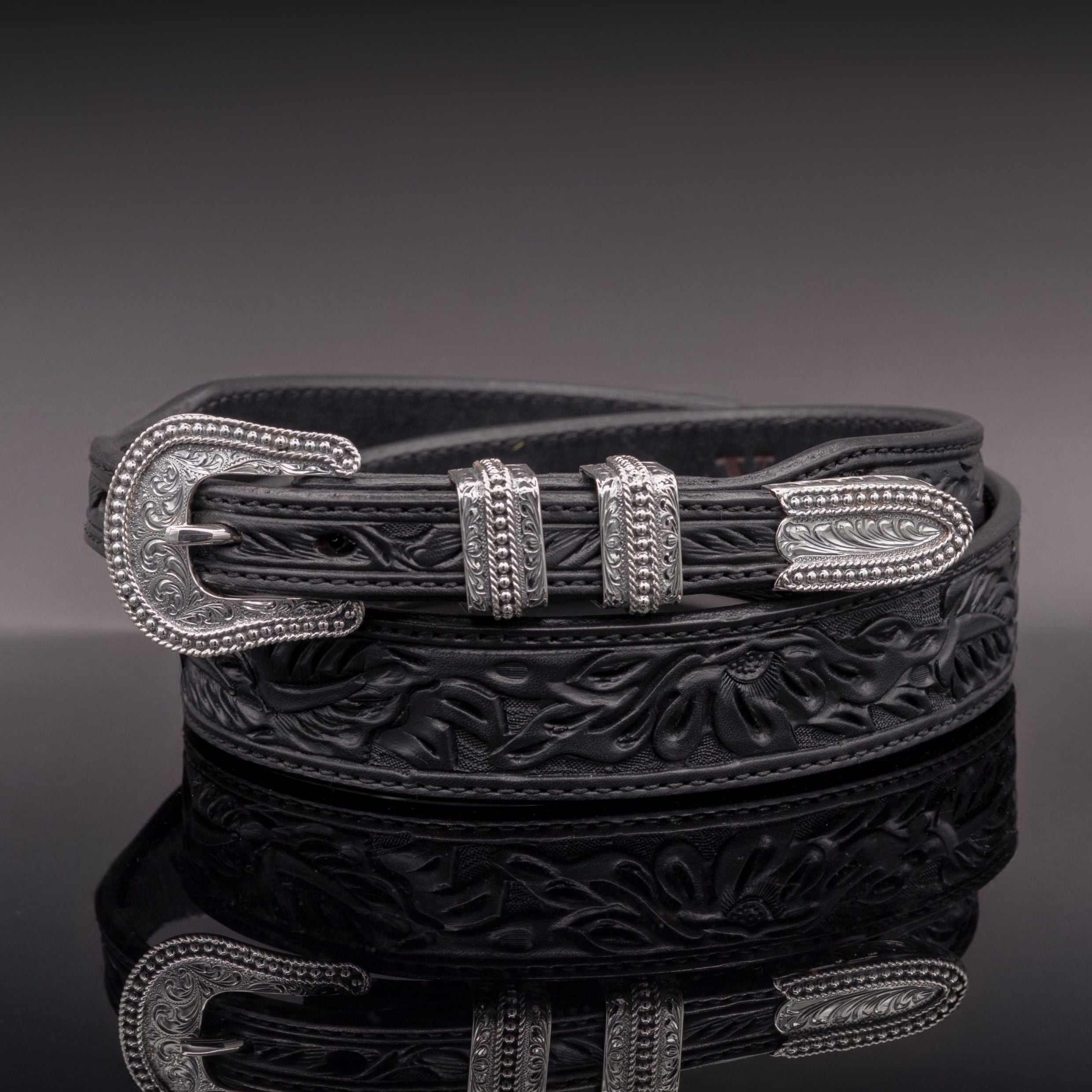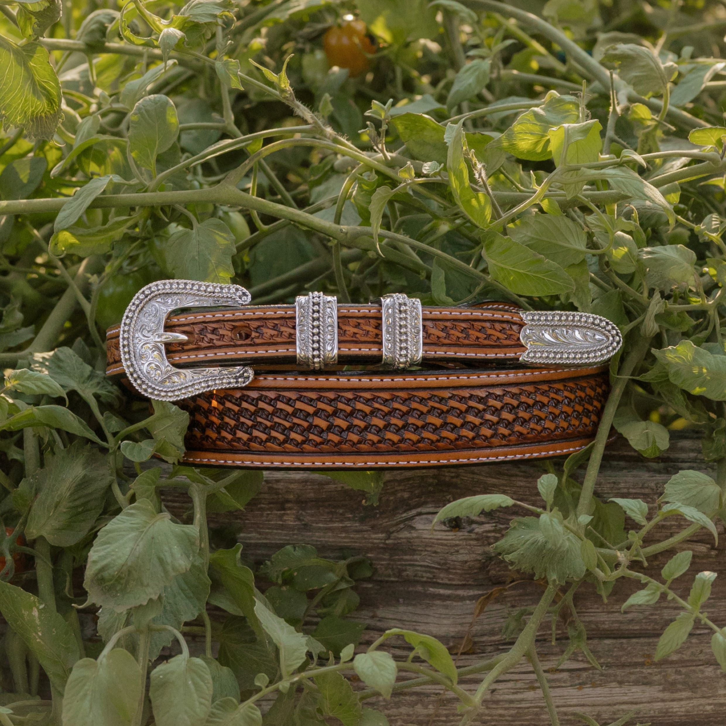 This 3/4" four-piece buckle set showcases a distinctive Western design, combining an antiqued, hand-engraved sterling silver base with hand-twisted rope and beaded edges. The flat, hand-cut buckle silhouette adds a refined touch, balancing intricate craftsmanship with a classic profile. A timeless set that brings subtle texture and detail to any belt.