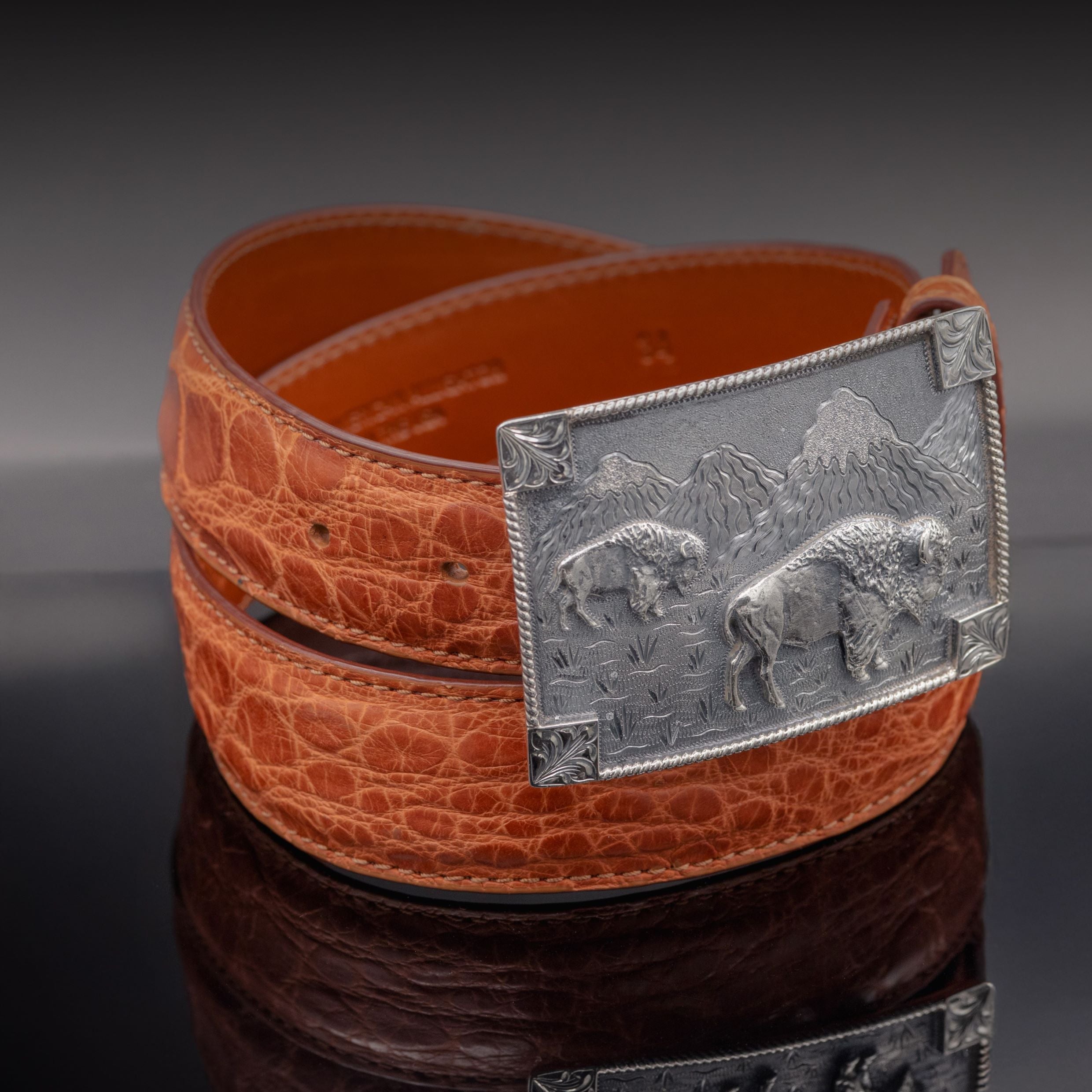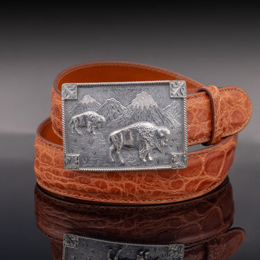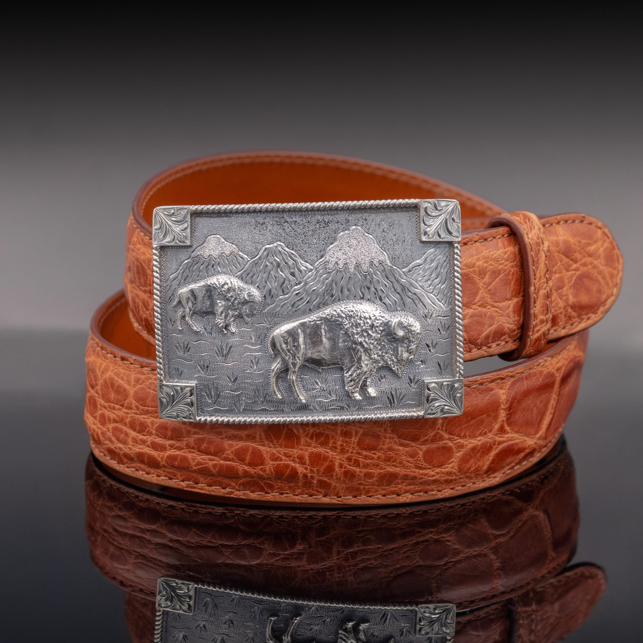 Nothing is more symbolic of the West than the American bison. The Roaming Bison Trophy Buckle features two powerful bison bulls in their native mountain habitat, with snow-covered peaks in the background. Raised corner scrolls are framed by a hand-twisted sterling rope, and the back side is fully hand-engraved with scrollwork.