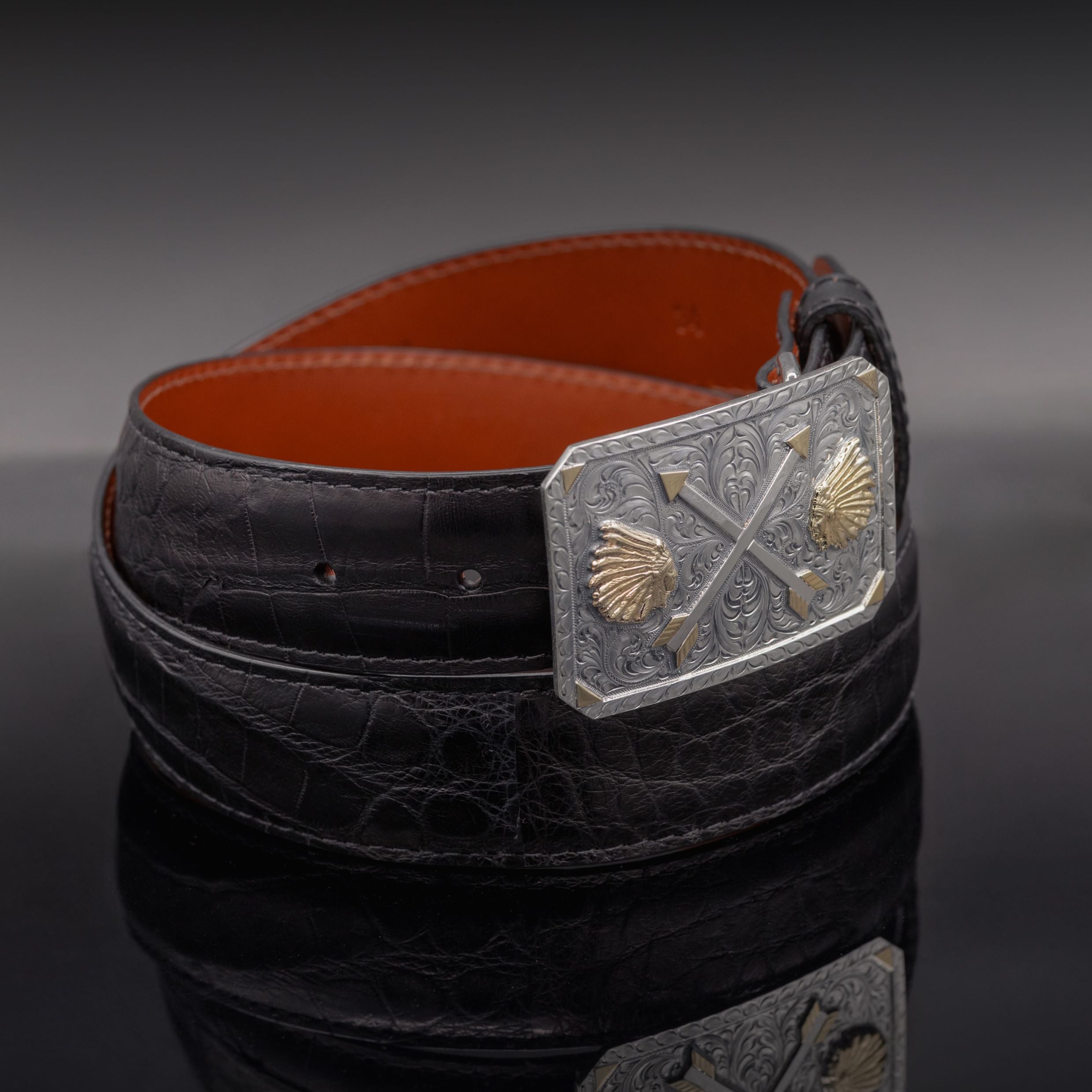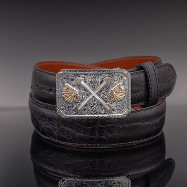 Hand-engraved and antiqued in solid sterling silver, this buckle showcases meticulous craftsmanship at every turn. Beveled corners frame the design, while crossed sterling silver arrows take center stage, each detailed with 14 karat gold arrowheads and fletchings. Cast chief head figures, accented in 14 karat gold, stand proudly on each side.