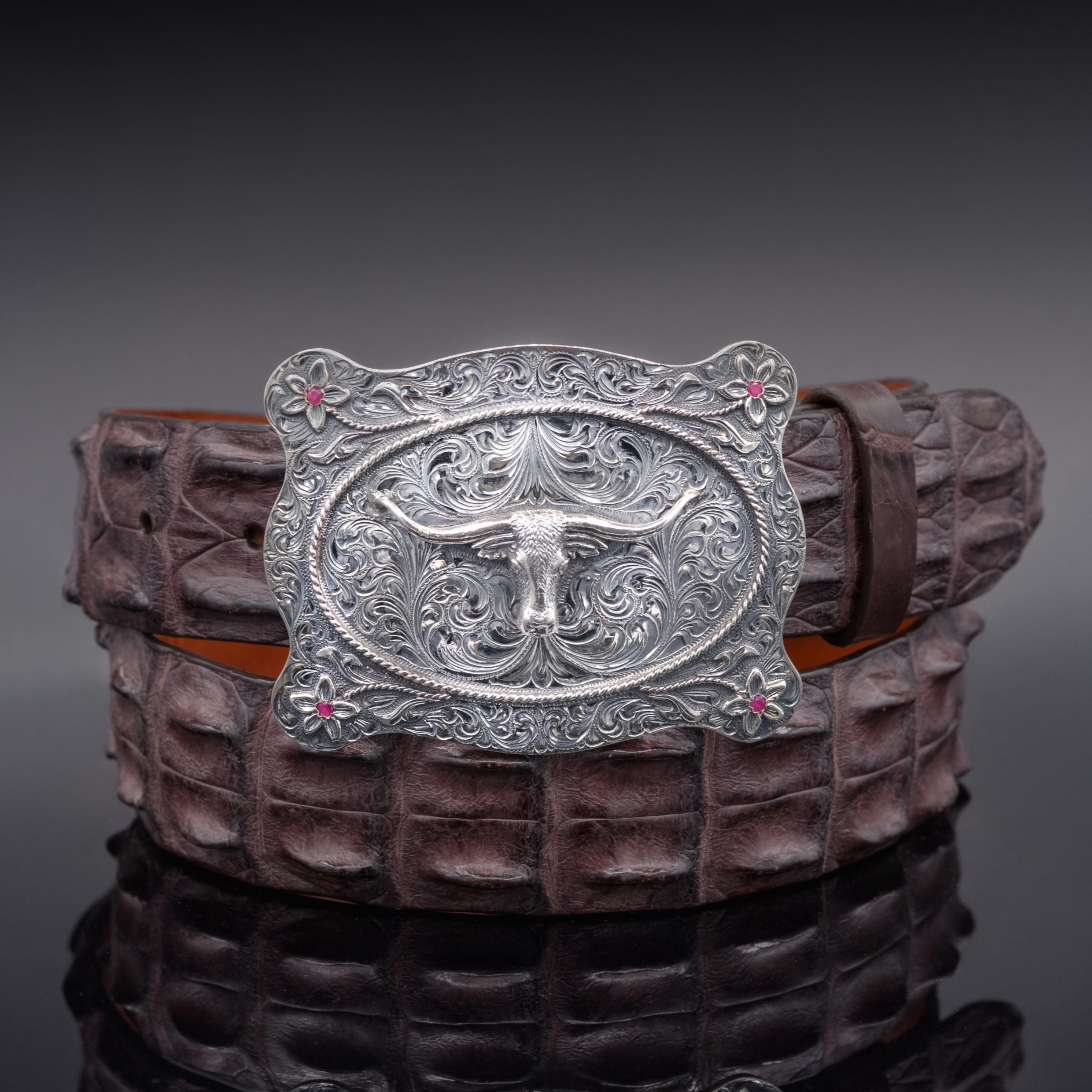 The Painted Desert combines the hand engraved oval center featuring a dimensional Longhorn, framed by an antique engraved, scalloped base. Flowers with ruby centers are nestled in each of the corners and joined to the center by twisted rope vines.
