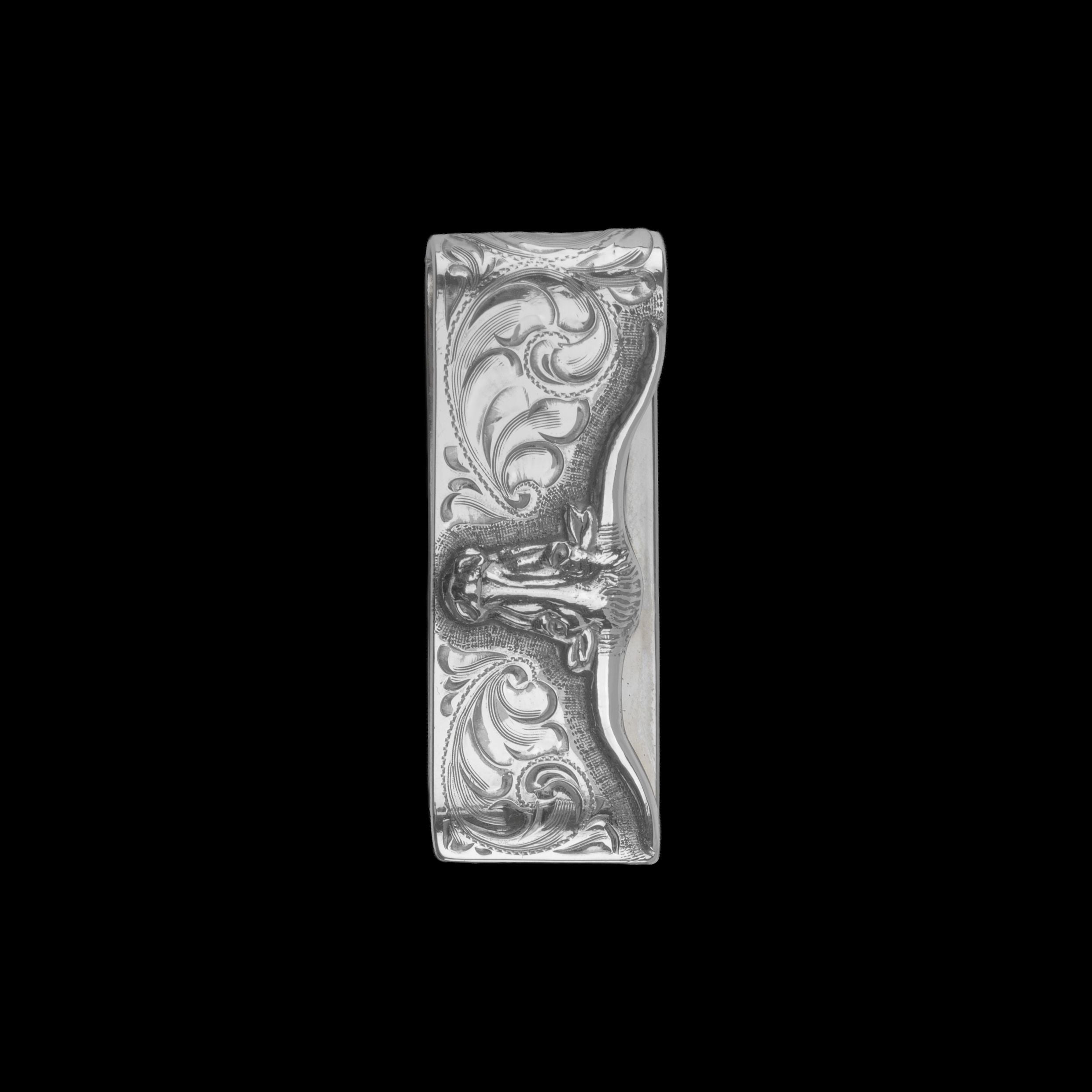 This beautifully crafted money clip showcases a sterling overlay design with hand-carved engravings on both the front and back. The silver silhouette of a majestic three-dimensional longhorn spans the entire front of the clip, making it a standout accessory.