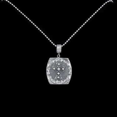 A tribute to Western craftsmanship, this sterling silver pendant is inspired by the Crossroads Concho Bracelet. The squared design features a hand-engraved scroll border framing a textured, oxidized sterling background. At its center, a sterling silver cross is meticulously crafted with individually hand-set sterling silver beads. Fitted on a beaded chain, this piece is a bold expression of heritage and fine craftsmanship.