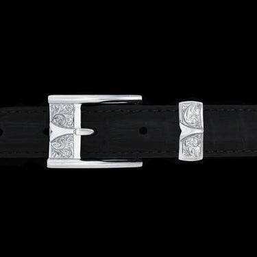 Crafted from solid .925 sterling silver, this 2-piece buckle and keeper set features a sleek, rectangular shape with softened edges, designed for a refined, feminine look. Hand-engraved scrollwork covers both pieces, adding intricate detail and texture. The polished silver border contrasts beautifully with the antique finish, enhancing the depth of the design.
