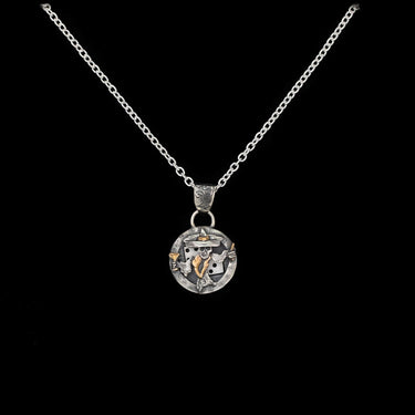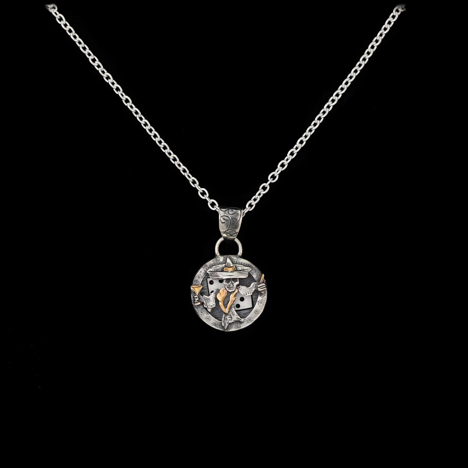 The Johnny Bones Shadow Pendant features our signature Johnny Bones figure in sterling silver and solid 14-karat gold, set on a 1" round sterling silver disc. Classic dice are featured in the open background behind him, adding depth and character to the design. Each element is hand-cut and hand-engraved, showcasing exceptional craftsmanship in every detail.