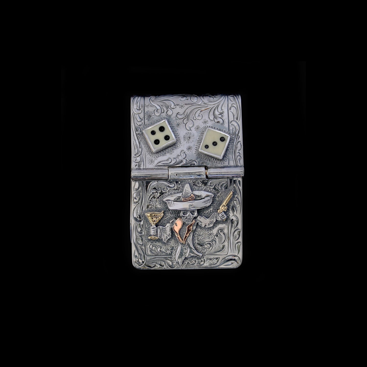 From the Johnny Bones Collection, this hand-engraved, antiqued sterling silver money clip is a true work of craftsmanship. Johnny’s lapels, six-shooter, and martini glass are each hand-cut from solid 14 karat gold, bringing a striking contrast to the design. Every detail is done entirely by hand, from the flip-up hinged cam system that smoothly secures your bills to the small antiqued dice—individually cut in half and mounted in sterling bezels. The intricate scrollwork wraps fully around the clip, continuing seamlessly onto the back.