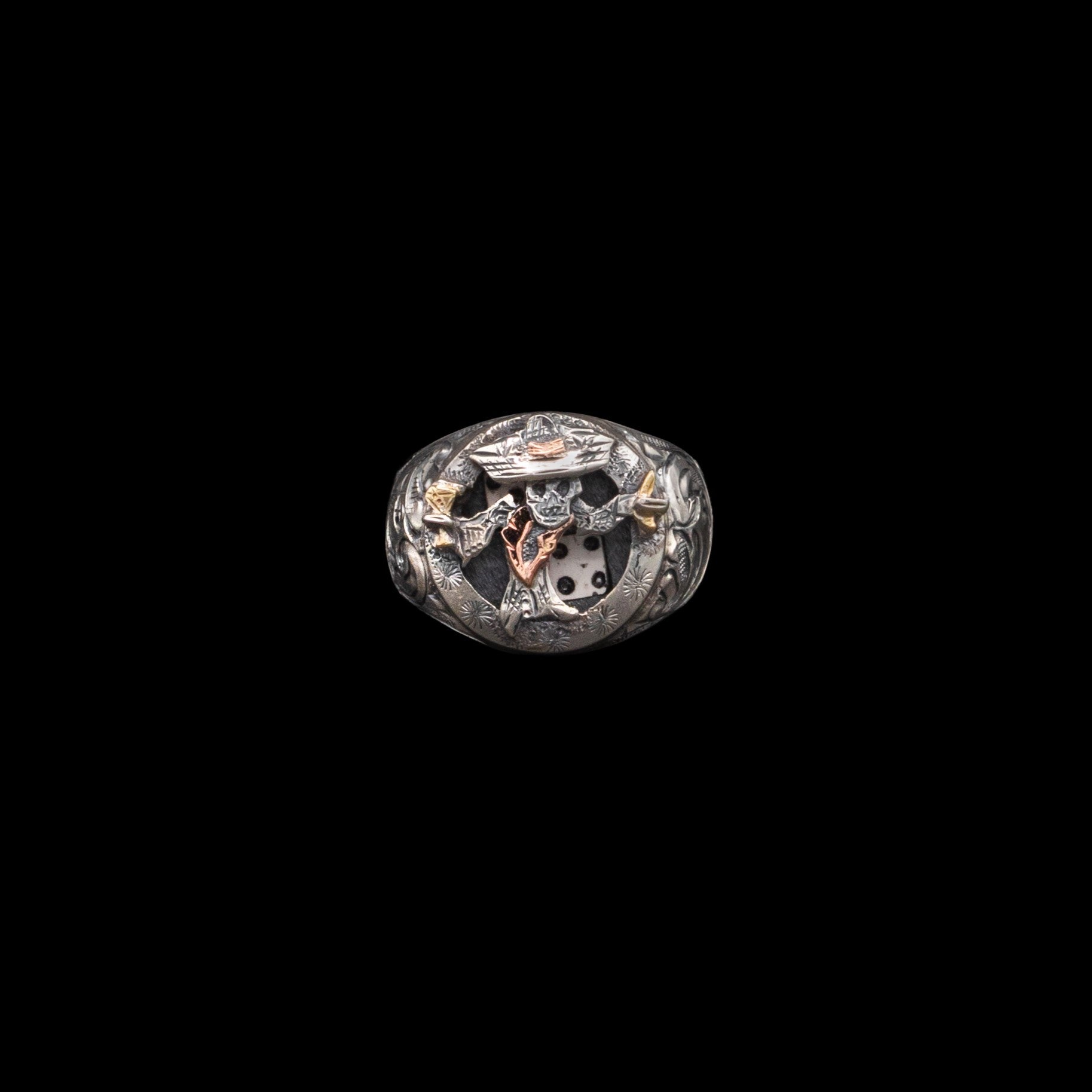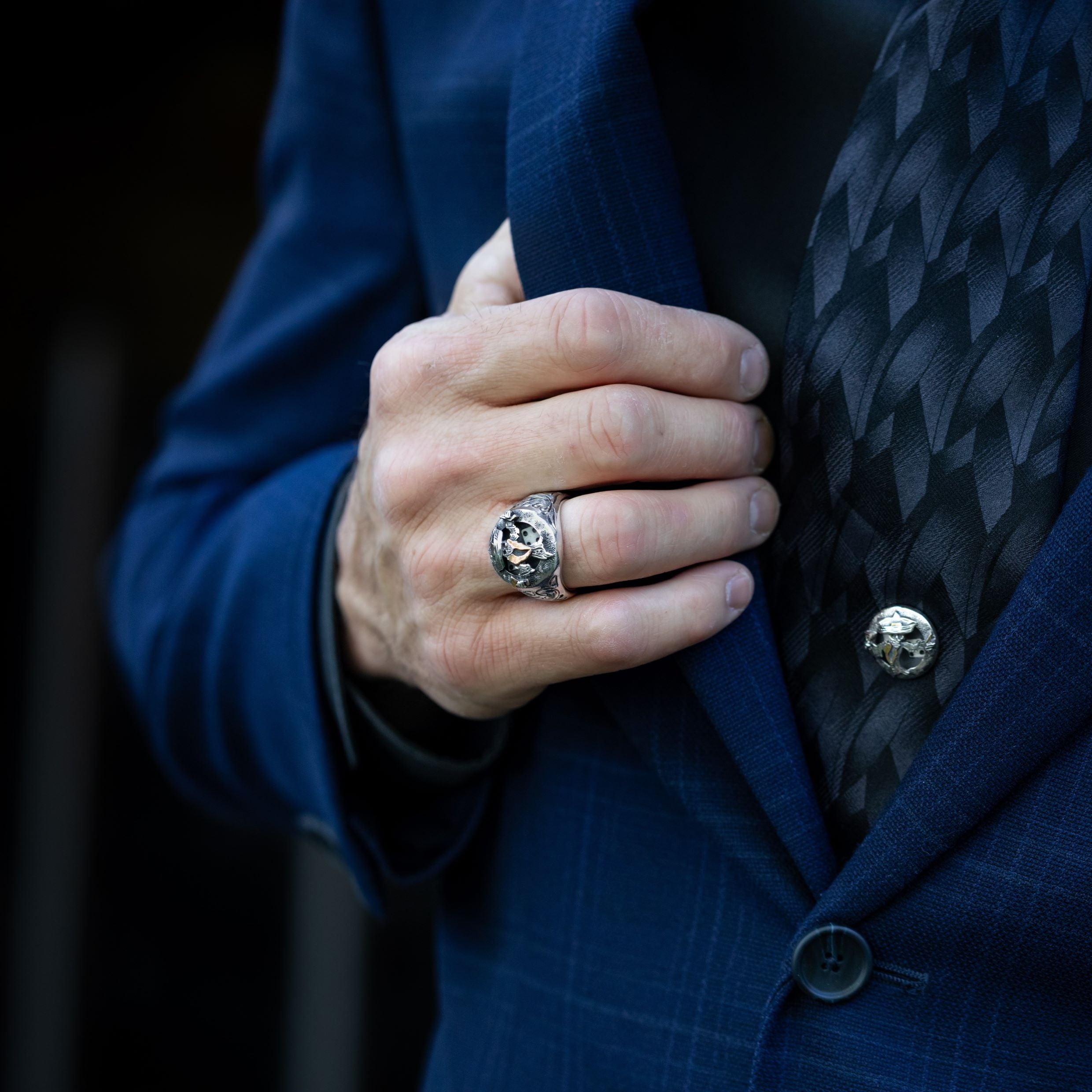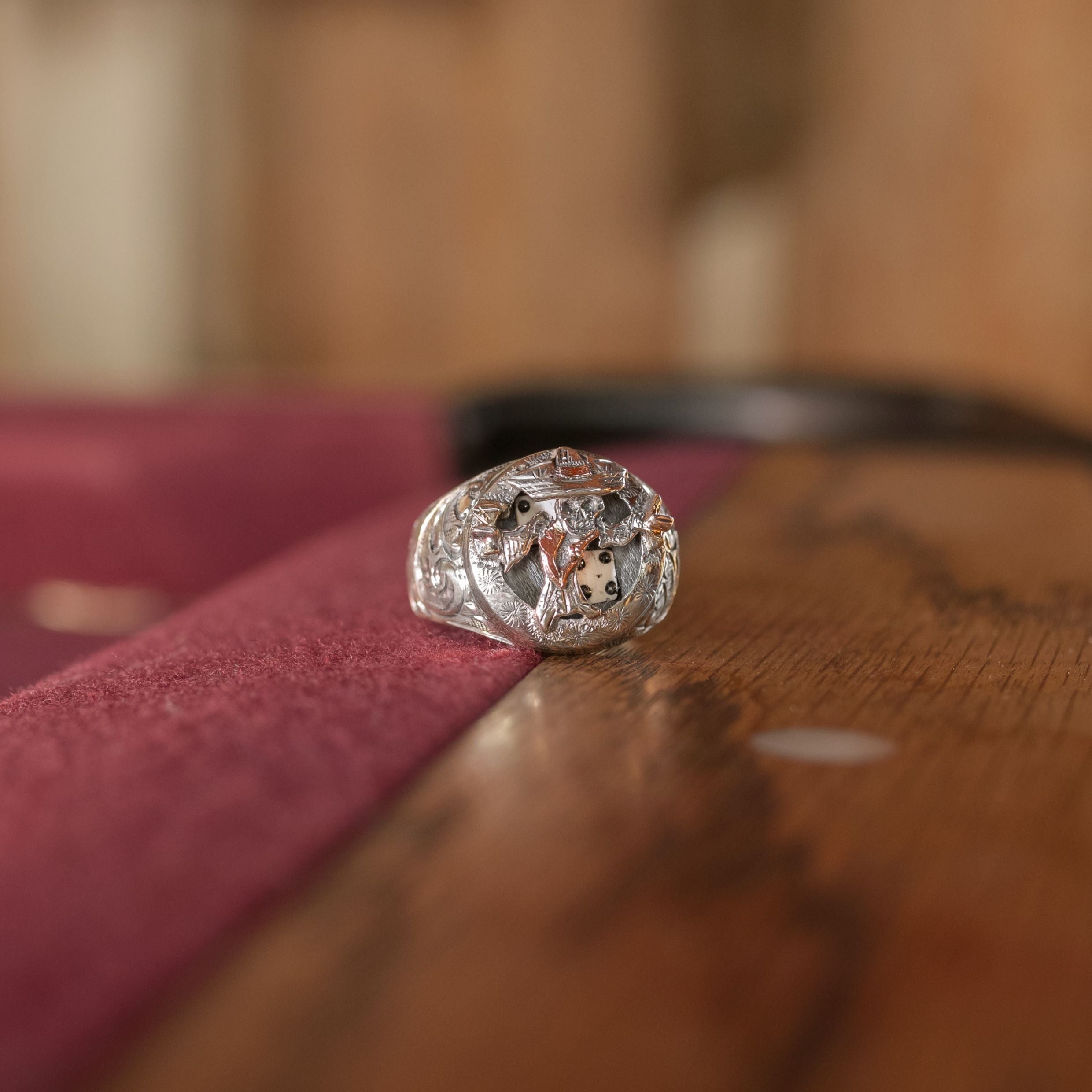 From the Johnny Bones Collection, this handcrafted signet ring is a showcase of artistry in solid sterling silver and genuine 14 karat gold. Johnny Bones comes to life through meticulous hand engraving and antiquing, with his lapels, six-shooter, and martini glass individually hand cut in 14k gold. The design is framed by small antiqued dice—cut in half and mounted in sterling bezels—while engraved scrollwork wraps seamlessly around the band. Every detail is done entirely by hand, making each ring a one-of-a-kind piece.