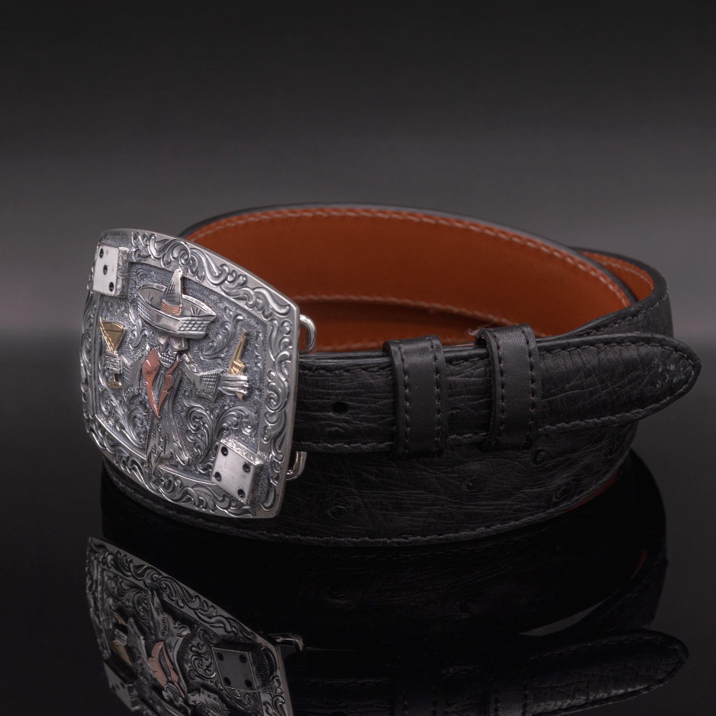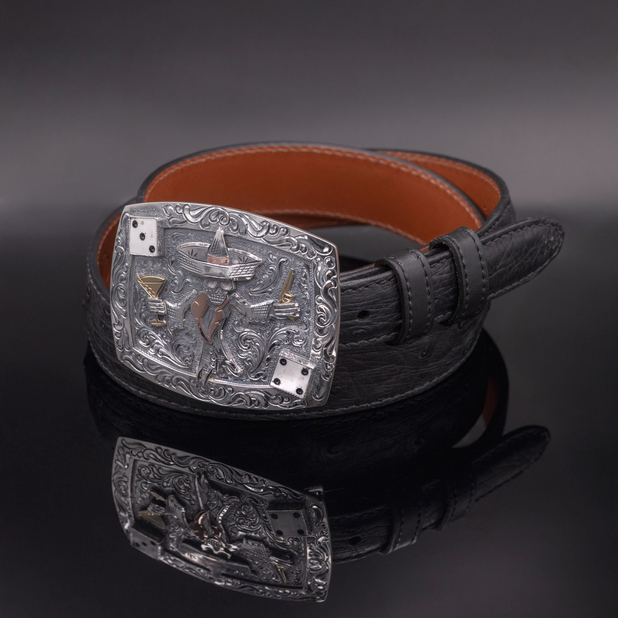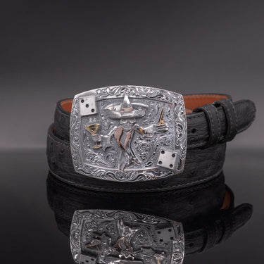Crafted from heavy, hand-engraved sterling silver, this trophy buckle now features hand-cut accents in 14 karat gold. Johnny is brought to life in sterling and gold, shown holding a six-shooter in one hand and a three-olive martini in the other. Each detail is layered to create a bold 3D effect. Handmade sterling bezels frame dice two corners, and the back of the buckle is fully line-engraved for a refined finish.