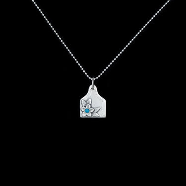 The Turquoise Blossom Eartag pendant features a silver blossom with a turquoise center stone against a sterling silver eartag edged with a new bright cut. Dainty silver leaves complete the simple, feminine charm of this piece.