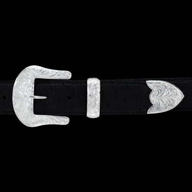 This unique design features a fully hand engraved antiqued sterling silver base and a flat hand cut buckle silhouette.