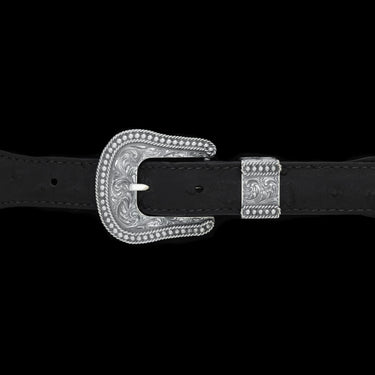 This sterling silver buckle set has a very distinctive design that combines an antiqued, hand-engraved sterling base with a hand-twisted sterling rope and beaded edges. Features a flat, hand cut buckle silhouette.