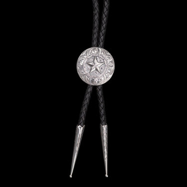 This all-sterling silver bolo tie features a fully hand-engraved disc with a raised star at its center—bold, dimensional, and unmistakably Western. A fresh twist on tradition, crafted to stand out.