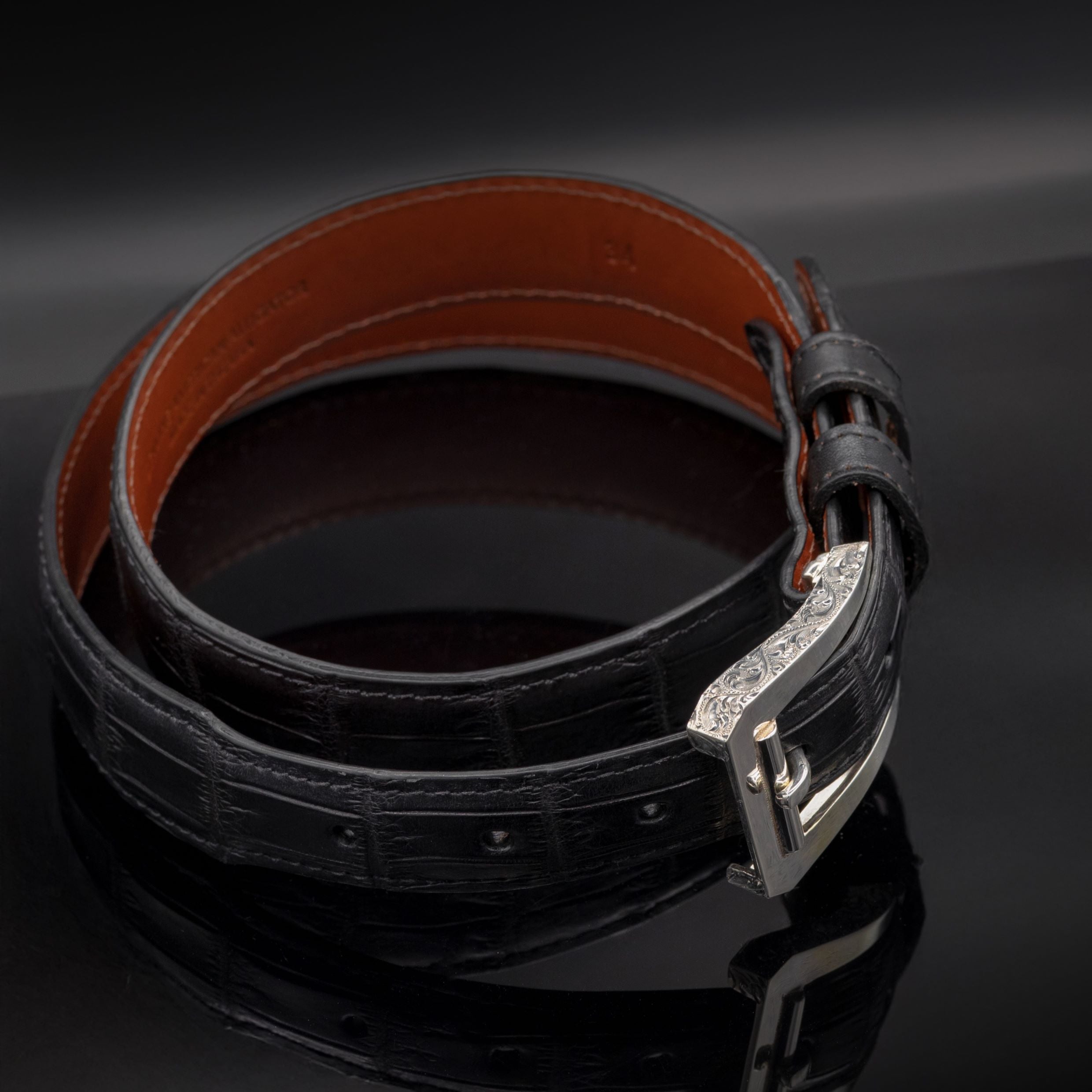 This new sharp-looking buckle is inspired by our best-selling L.O.D.O buckle. Made of sterling silver, it is smooth on top and has intricately hand-engraved scrolls on the sides.