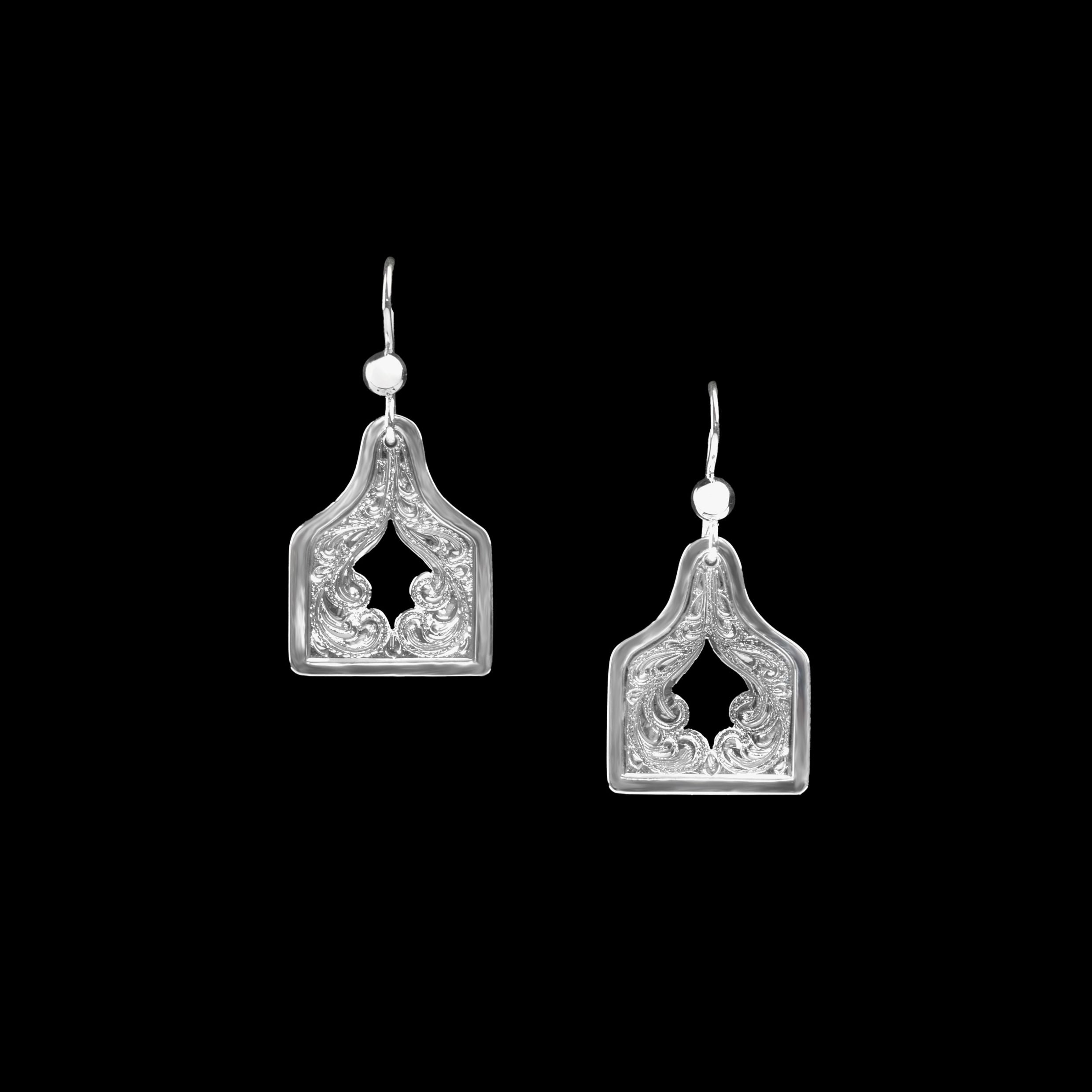 Crafted in a 1" horse-shaped silhouette with an open center, each piece is fully engraved by hand, highlighting depth and detail from every angle. Finished with sterling silver French hooks, they offer effortless movement and a timeless expression of Western craftsmanship.