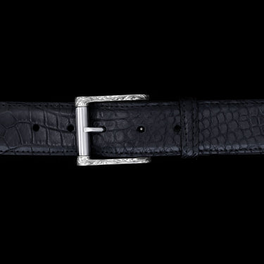 Elevate your style with The Torreon Roulette Buckle. This magnificent, sterling silver buckle features a meticulously hand-engraved pattern that is sure to impress. Pair it with our selection of exclusive exotic leathers and make a statement that sets you apart from the crowd.