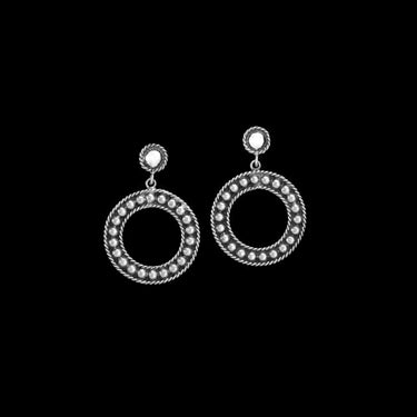 Specifications 1" sterling disc with open center, 3 mm hand-set sterling beads, and twisted rope edges. Dangling from a 5 mm smooth sterling bead with rope detail and hypoallergenic stainless steel post.