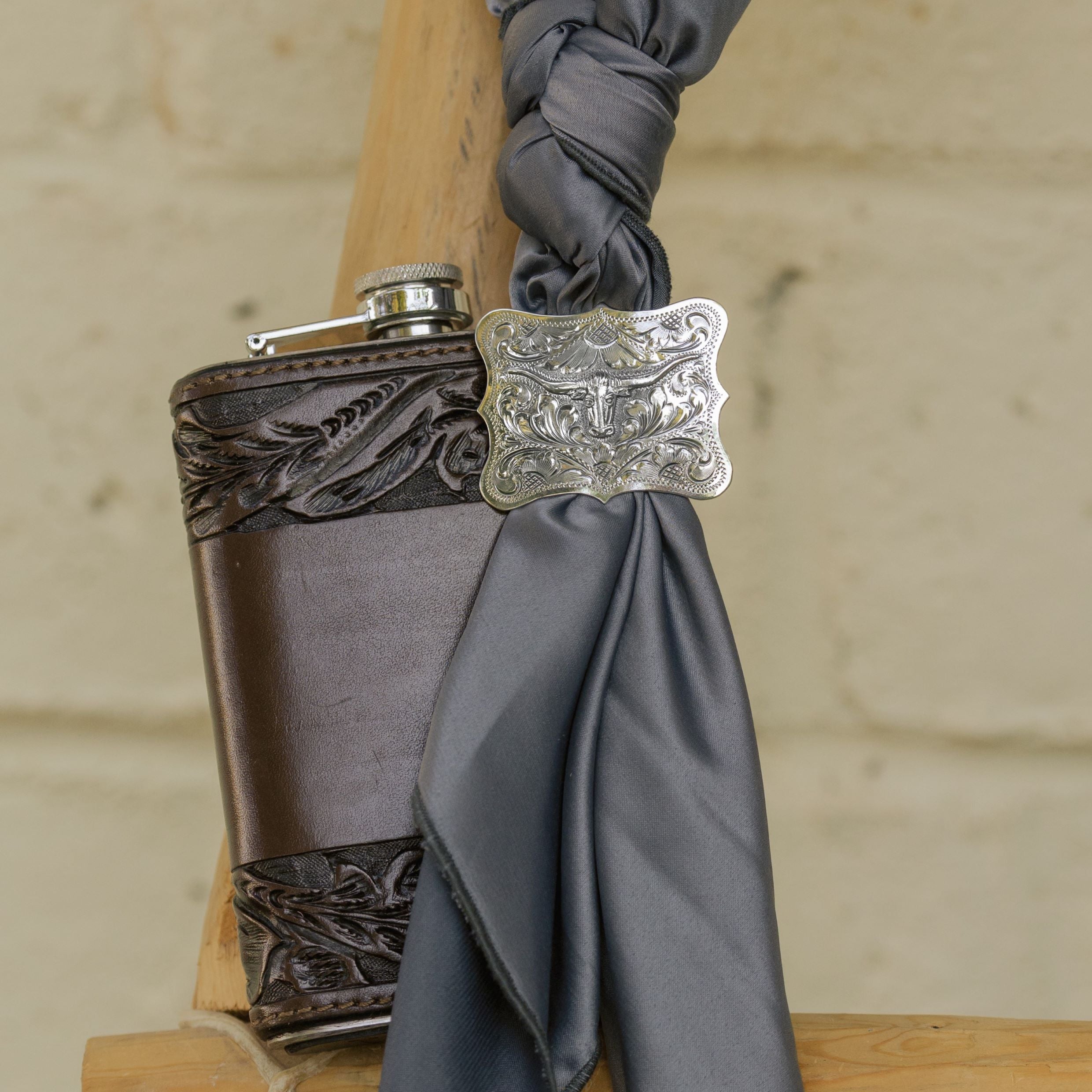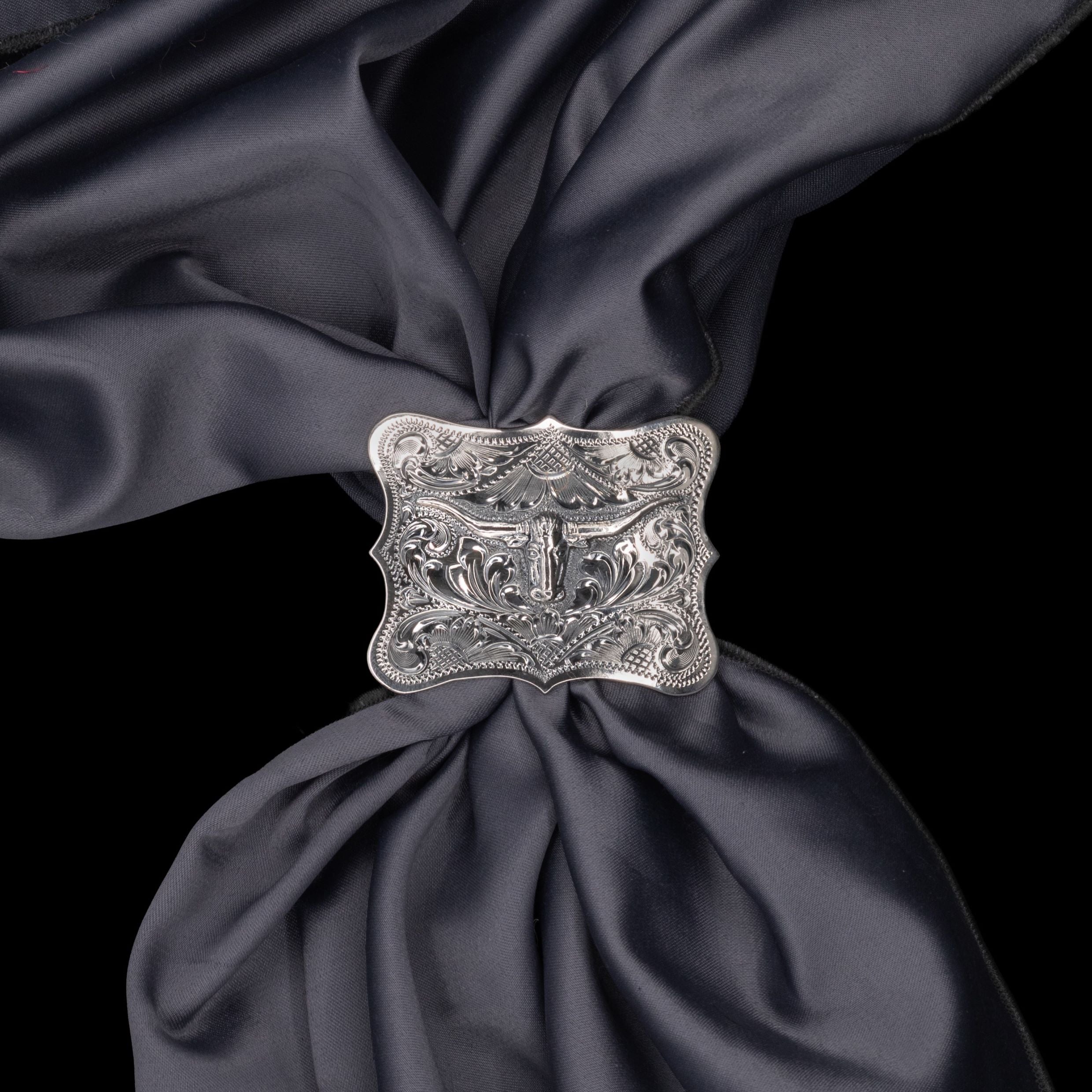 Handcrafted in solid sterling silver, this scarf slide is styled after a traditional Western buckle. A detailed longhorn figure stands out against an antiqued background, framed by hand-engraved scrolls and flowers.