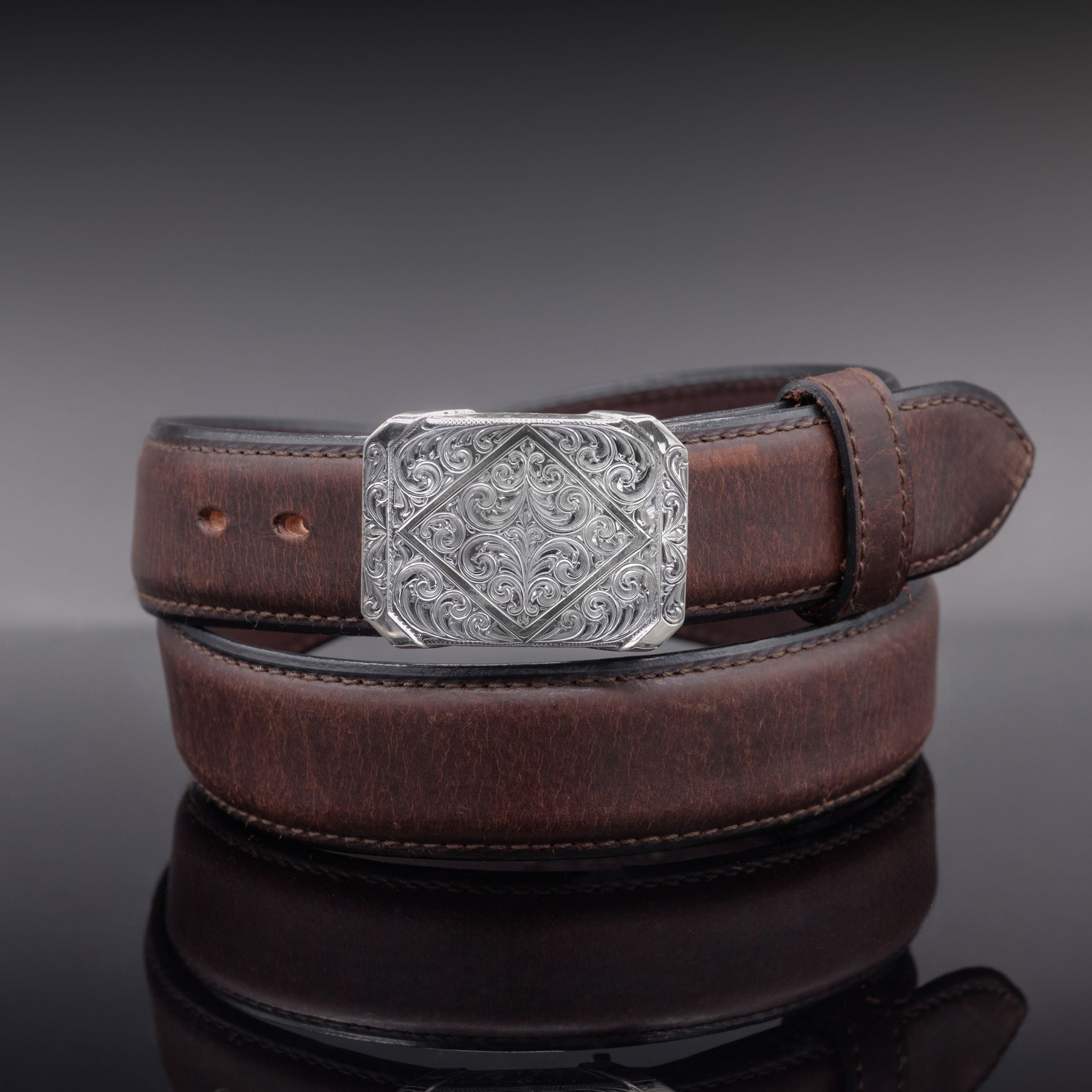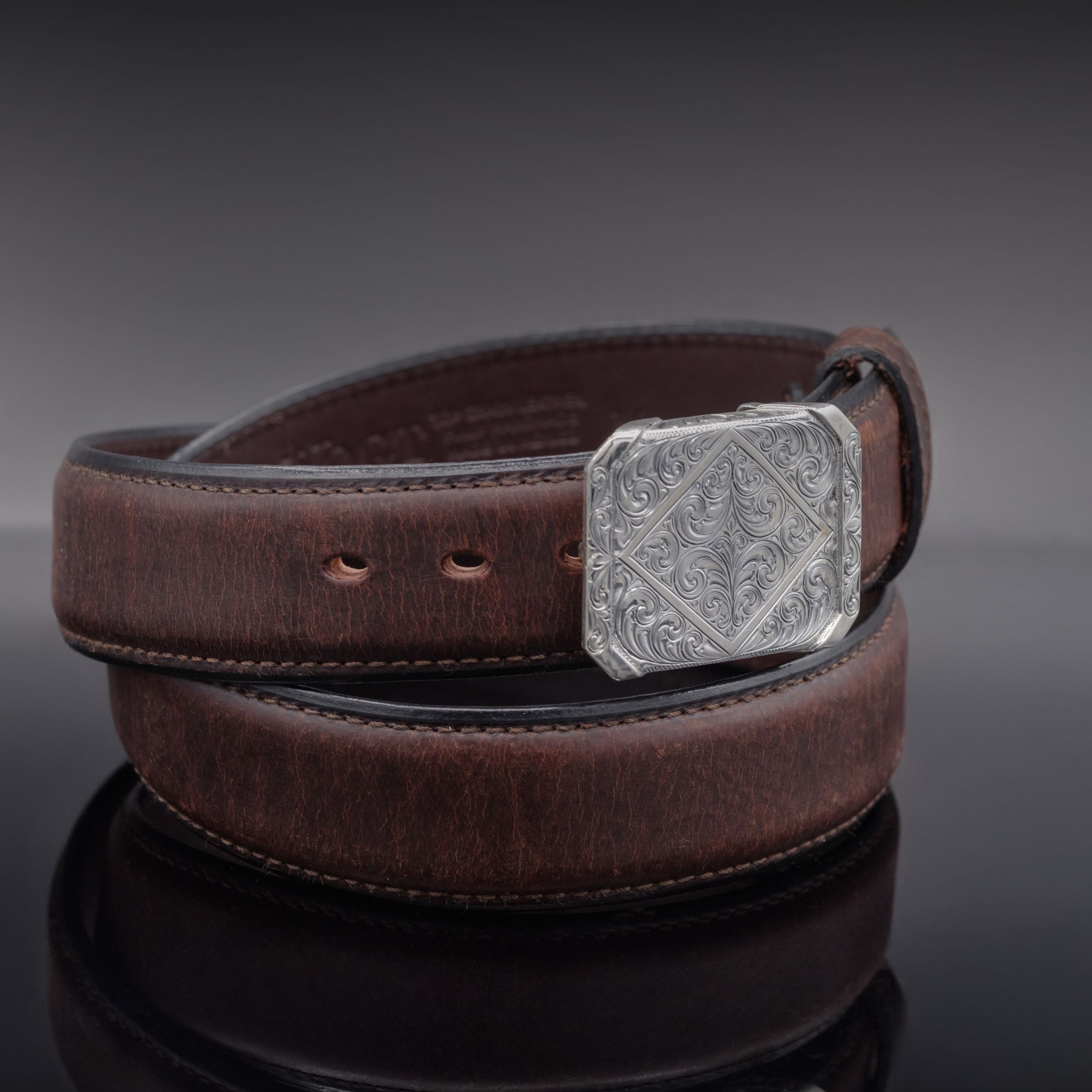 Crafted from solid .925 sterling silver, this newly released trophy buckle features a striking diamond-shaped center framed by intricate hand-engraved scrollwork. Designed with a smaller, softer silhouette for a more feminine feel, the raised border and softened corners lend a modern refinement. With its balance of bold detail and elegant scale, this piece is a beautiful, minimalist option for women seeking standout silver with a subtle edge.