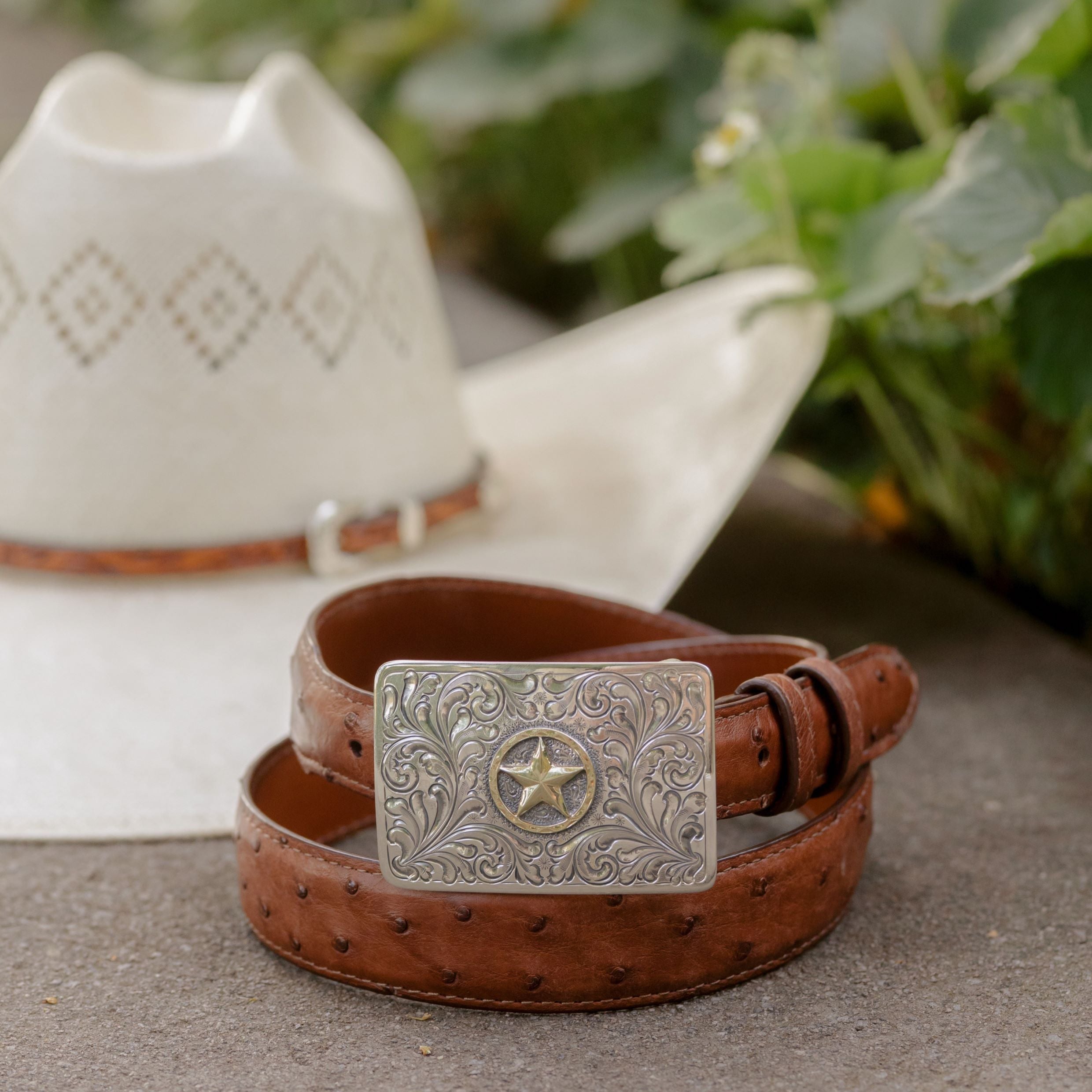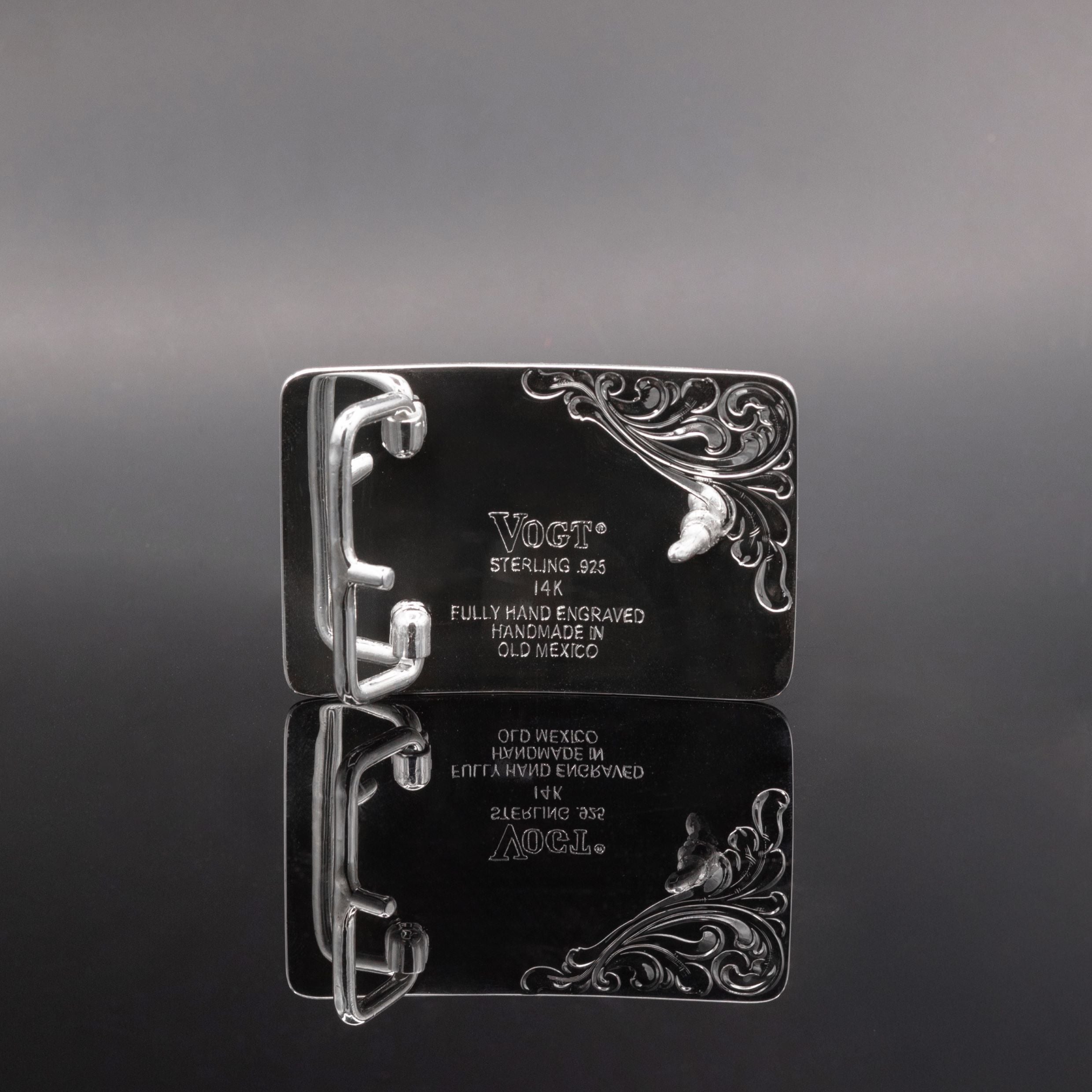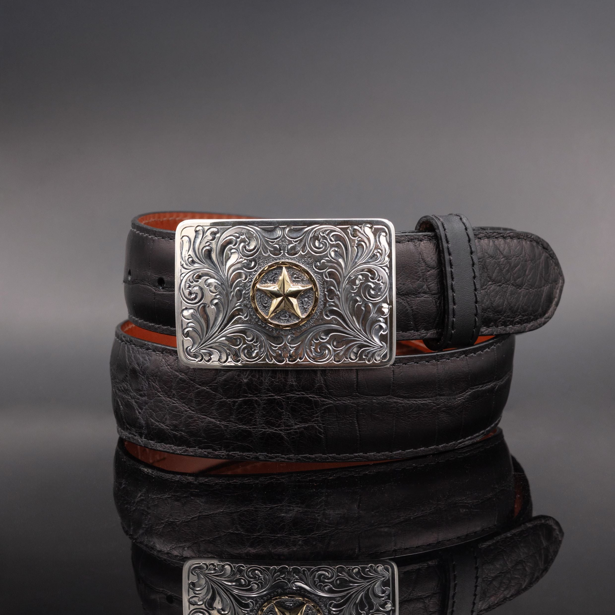 Crafted from sterling silver and detailed with a 14K gold star, this fully hand-engraved trophy buckle features intricate scrollwork and a smooth edge. A timeless piece that pays tribute to a Western icon.