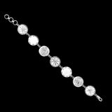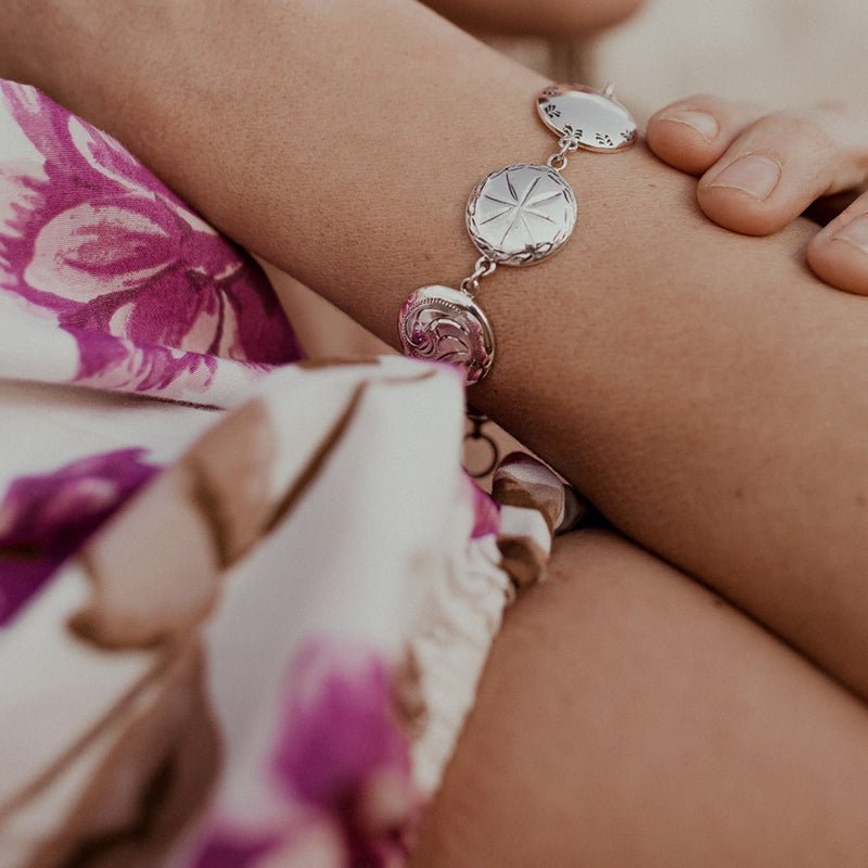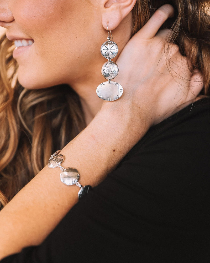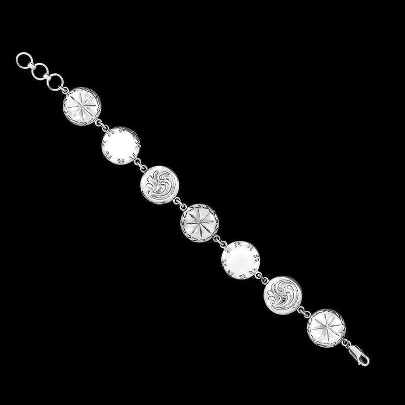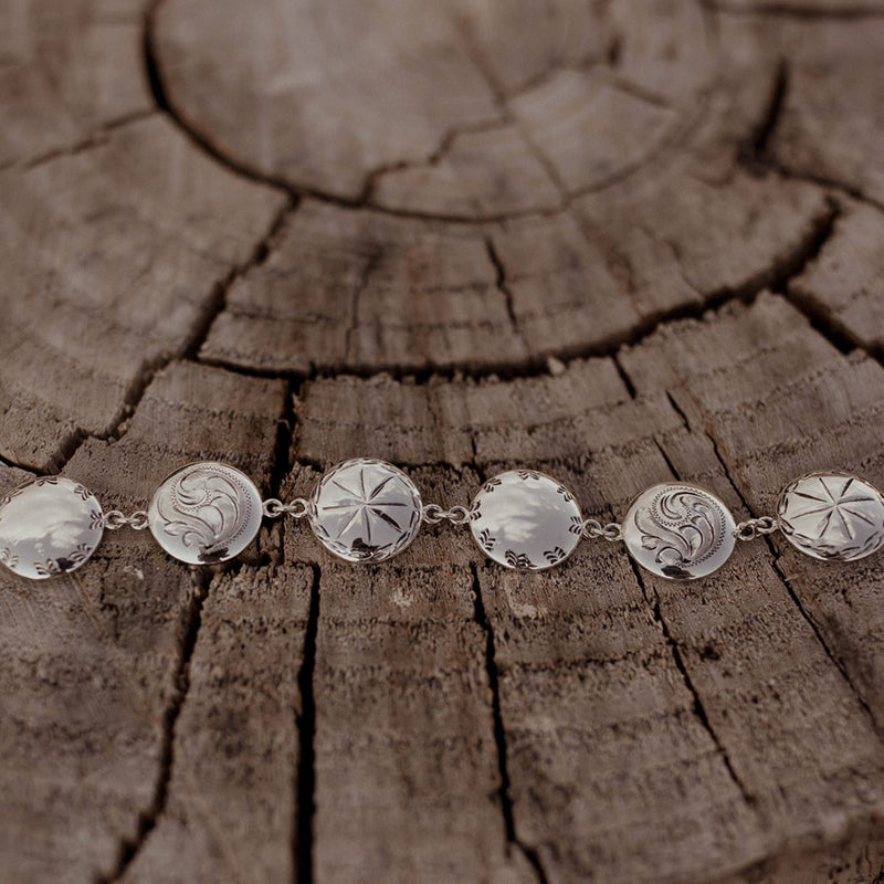 The Kimberly Concho Bracelet features 3 unique hand engraved designs on 7 round conchos with a chain and clasp.