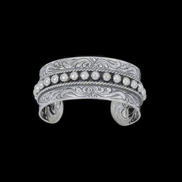 Crafted from solid .925 sterling silver, this 1-inch wide cuff features individually hand-set sterling silver beads set against an oxidized background, framed with a hand-twisted sterling rope edge. Traditional hand-engraved scrollwork covers the outer surface, while the inside is partially engraved for a refined finish.