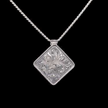 Add a touch of Western refinement with The Iris Western Pendant. Handcrafted from sterling silver and detailed with a beautiful hand-engraved pattern, this stunning piece is finished with a sculpted sterling silver flower and a hand-twisted rope edge. Elegant, timeless, and made to stand out.