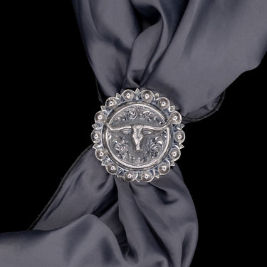 This sterling silver scarf slide is built with unmistakable Western character. At the center, a raised longhorn head commands attention, framed by hand-engraved scrollwork that brings depth and movement. Along the outer edge, individually hand-soldered beads create a bold border, each one placed with precision by our silversmiths.