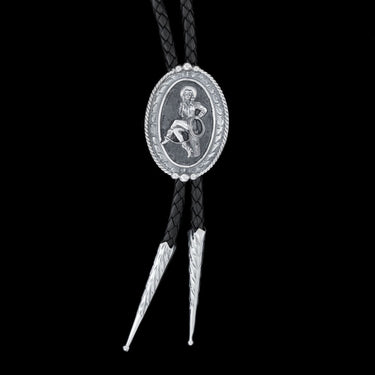 The Mabel Bolo is a sterling silver masterpiece, featuring the iconic Mabel Strickland figure amidst intricate hand-engraved patterns and sterling silver beads. The oxidized background and hand-twisted rope edge, complemented by a light antique finish, highlight the exquisite craftsmanship of Vogt Artisans. Guaranteed for a lifetime, The Mabel Bolo celebrates the larger-than-life legacy of a true Western icon.
