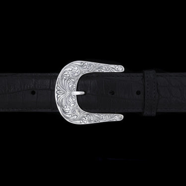 A new look to an old style. The Plumas is crafted in solid sterling silver and features engraved side plates that create a channel for your 1½" belt. An antique finish adds depth, while the domed profile provides a bold presence.