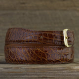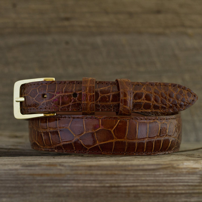 Our Cognac Alligator exotic leather belts feature a combination of skilled craftsmanship and the highest quality raw materials. Finished with a single stitched edge and lined with premium top grain leather, our exotic belts are the epitome of style and sophistication.