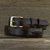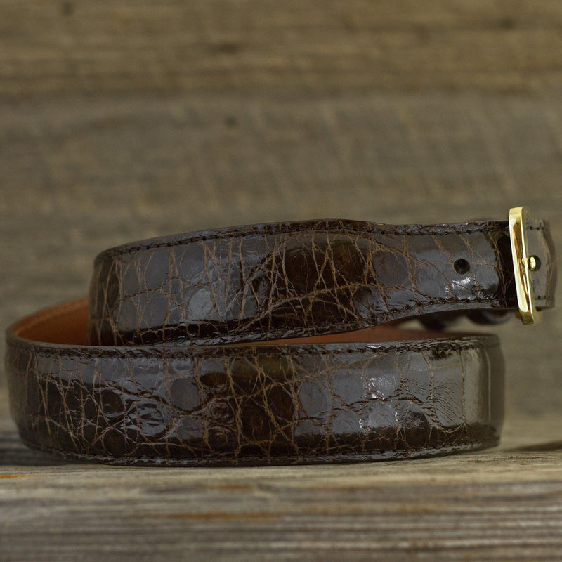 Our Chocolate Alligator exotic leather belts feature a combination of skilled craftsmanship and the highest quality raw materials. Finished with a single stitched edge and lined with premium top grain leather, our exotic belts are the epitome of style and sophistication.