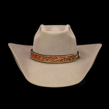 The Deluxe Sheridan Hatband is a 1" thick hatband with a tapered sterling silver buckle. The russet hatband is hand tooled with our classic Sheridan floral design, and also features stitched edges, creating a bold hatband for the bold cowboys.