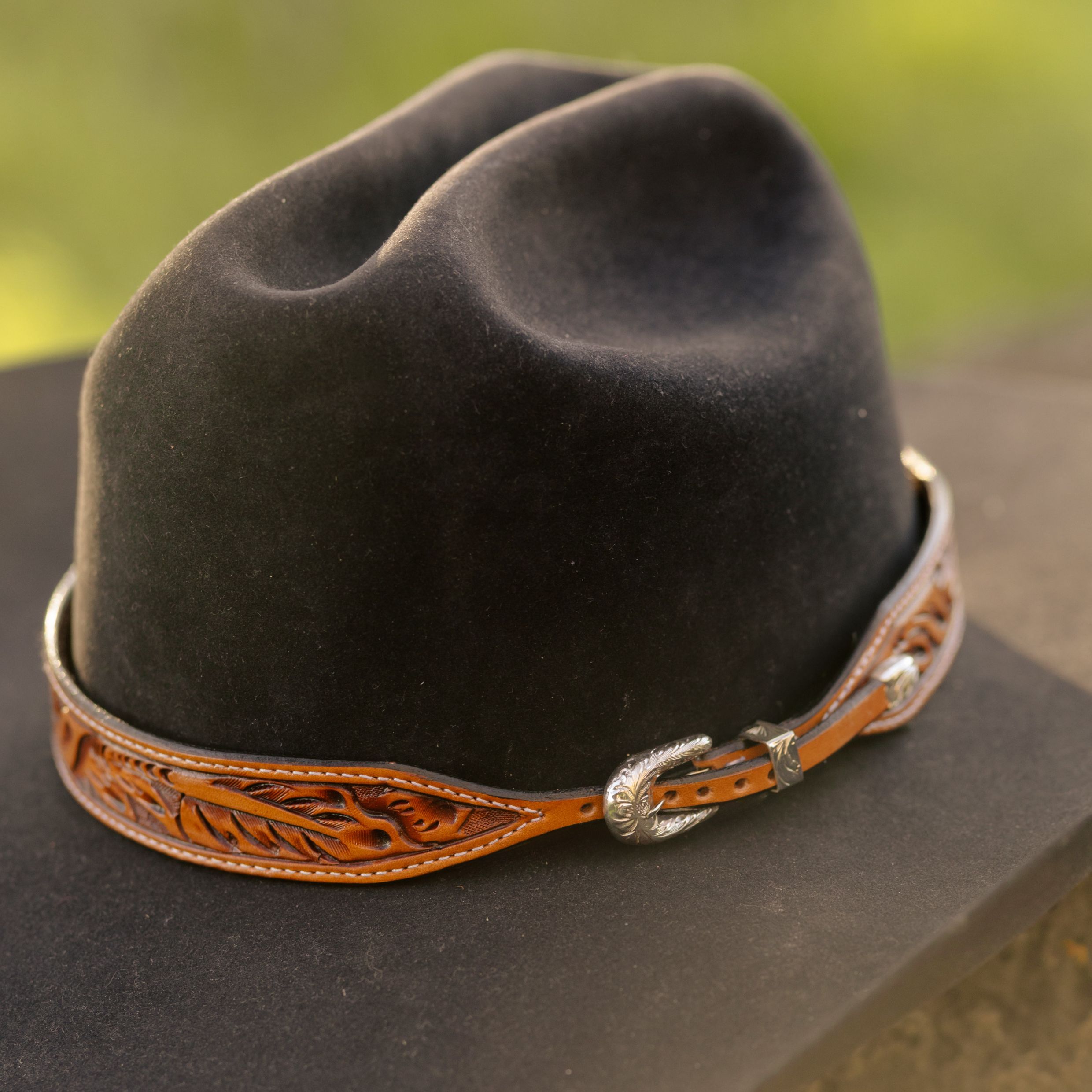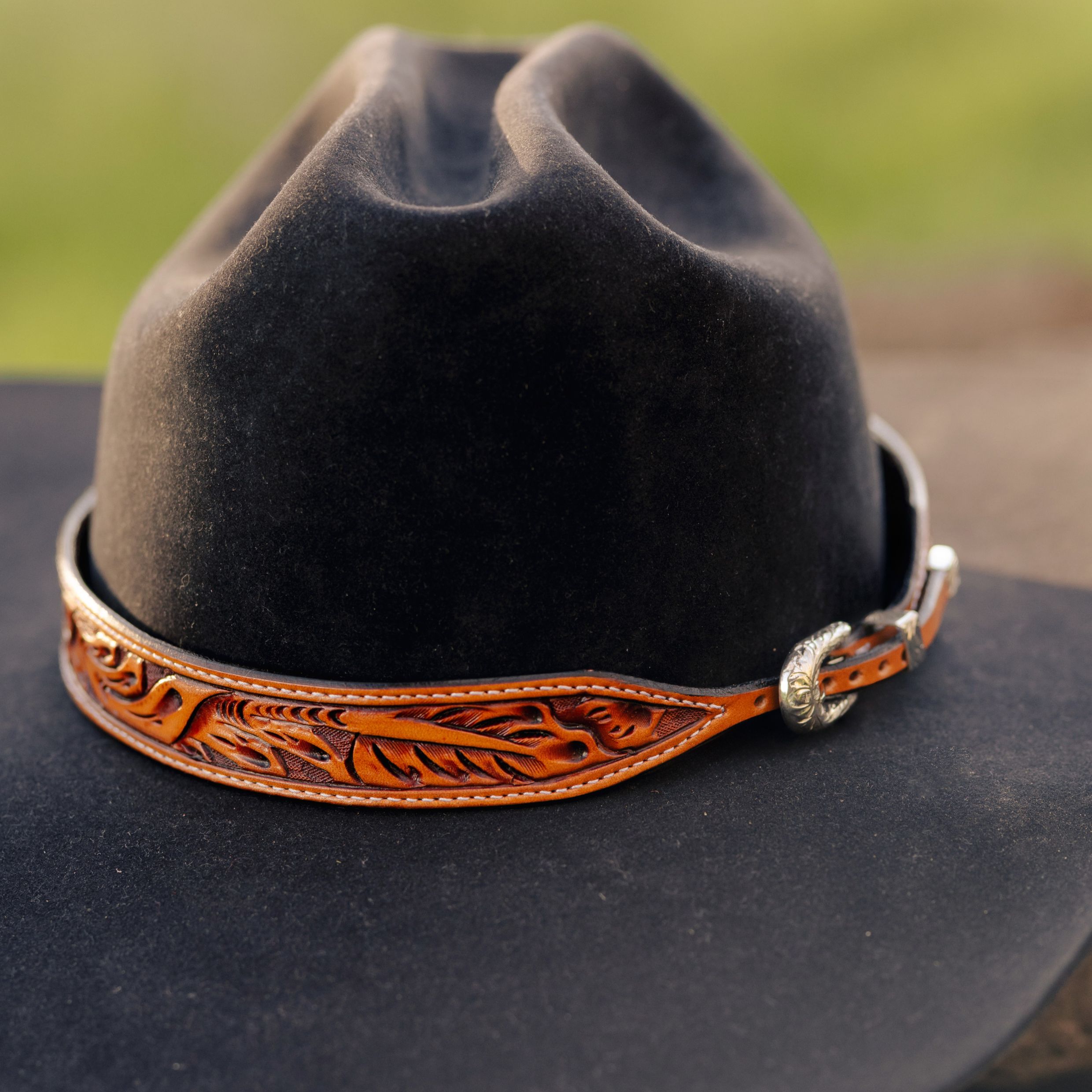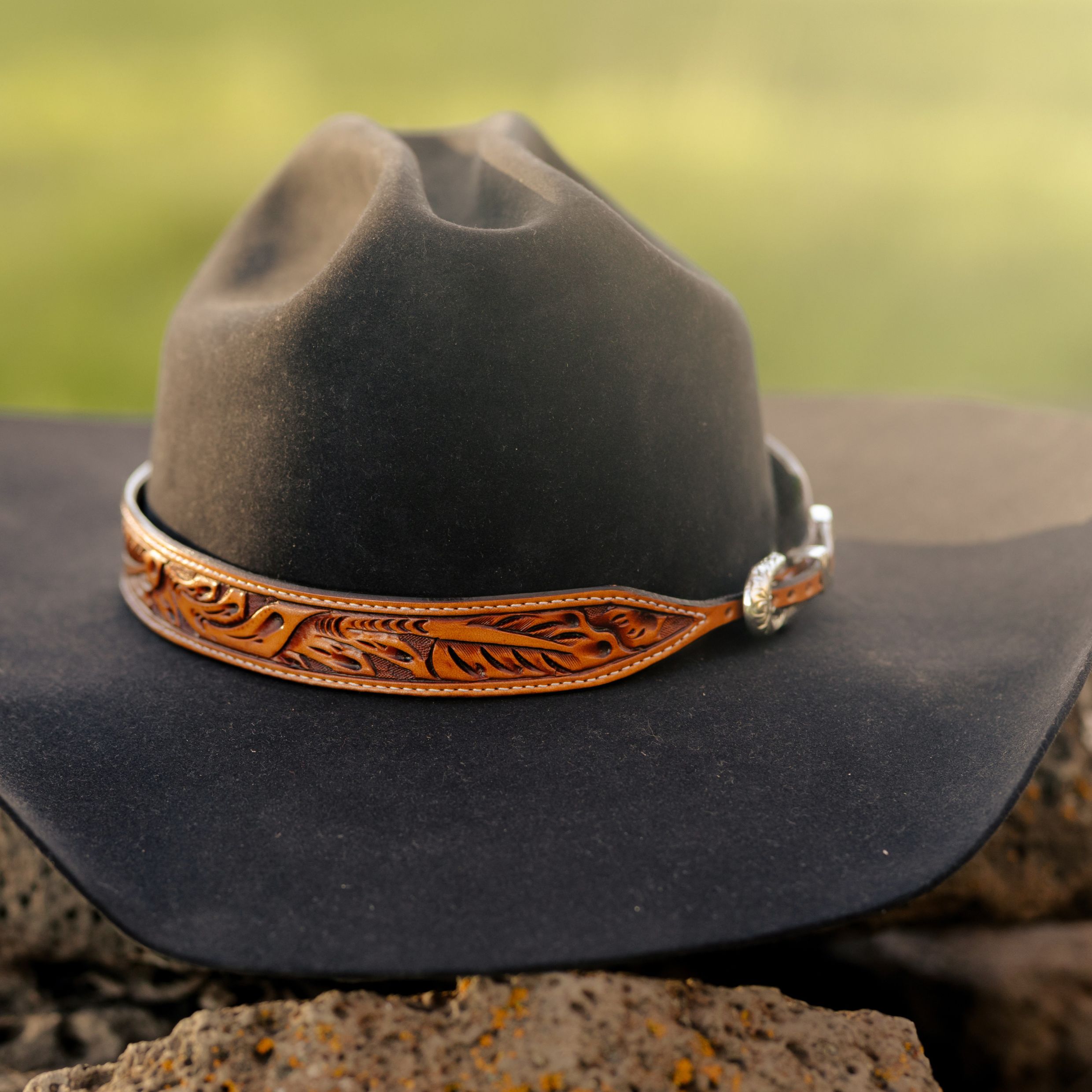 The Deluxe Sheridan Hatband is a 1" thick hatband with a tapered sterling silver buckle. The russet hatband is hand tooled with our classic Sheridan floral design, and also features stitched edges, creating a bold hatband for the bold cowboys.
