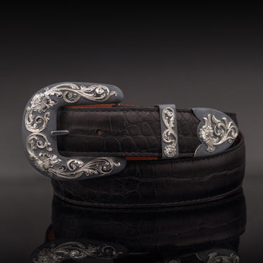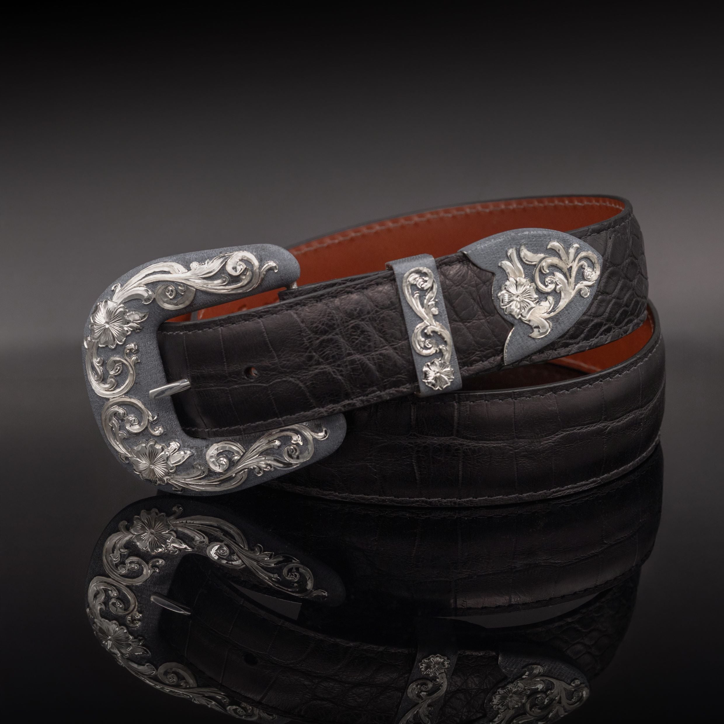 This sterling silver buckle set, designed to fit a 1 ½" belt, showcases intricate hand-cut scrollwork overlaid on a dark antique background for striking contrast. Every curve and floral detail is carved by hand, making each piece one of a kind. It is finished with a classic keeper and sculpted tip.