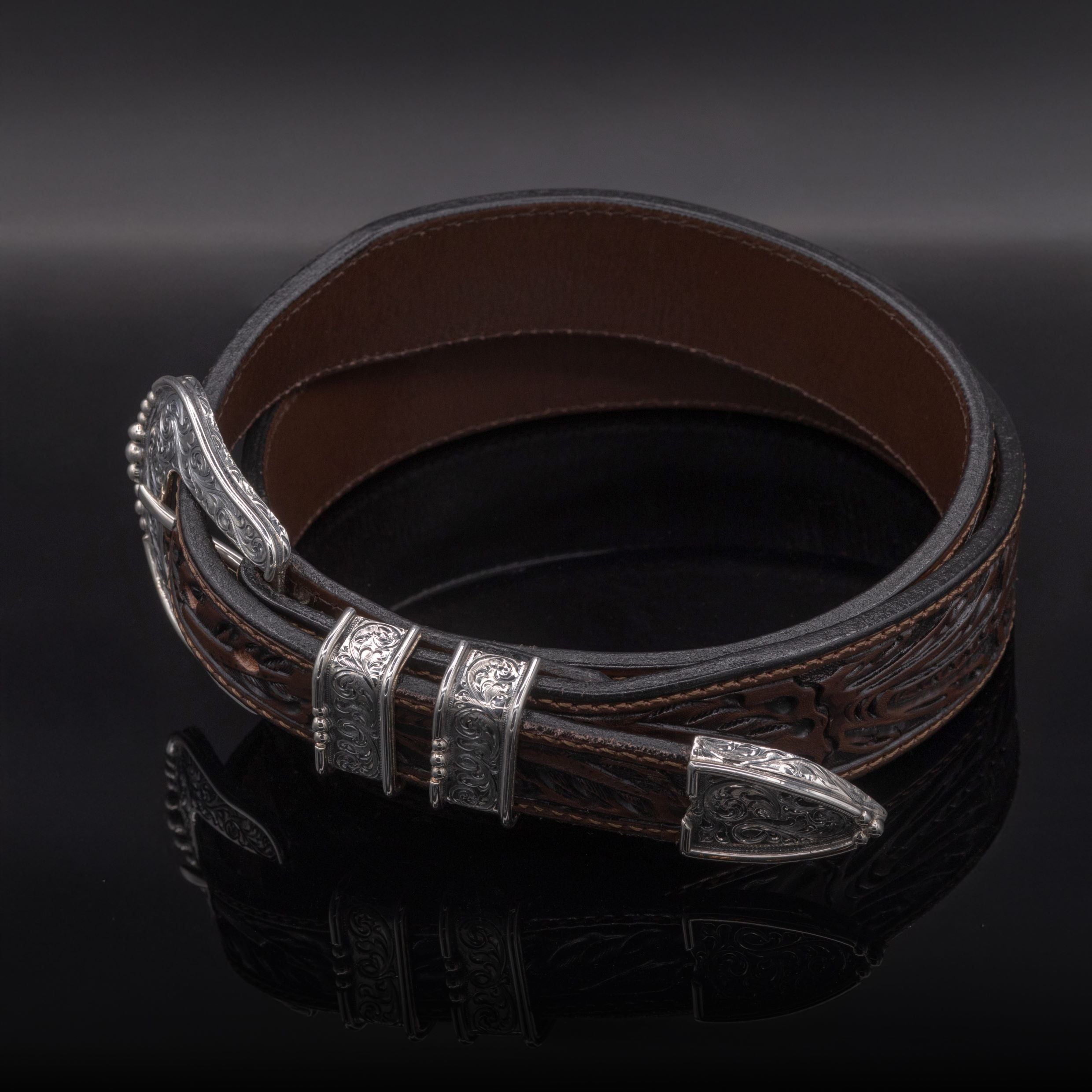 This four-piece set features an intricate interlaced pattern on a solid sterling silver No. 240 frame. The buckle, framed by smooth sterling silver rounded edges, is accented with hand-soldered sterling silver beads. The matching interlaced pattern extends across the keepers and tip, showcasing expert craftsmanship and timeless style.