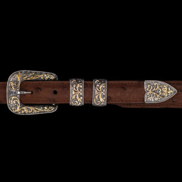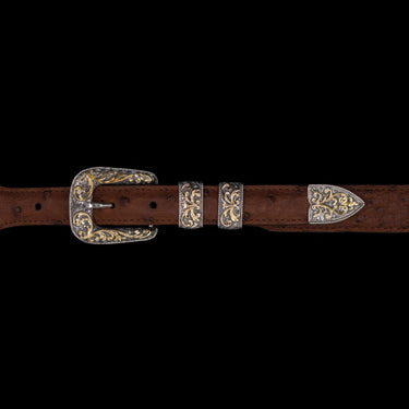 A striking 1" four-piece set crafted in sterling silver and 14KT gold. Clean, contemporary lines meet hand-cut Western scrollwork—each gold detail carefully applied to an antiqued, hand-engraved sterling base. Finished with a sterling silver rope edge, this set is a bold blend of traditional craftsmanship and fine artistry.