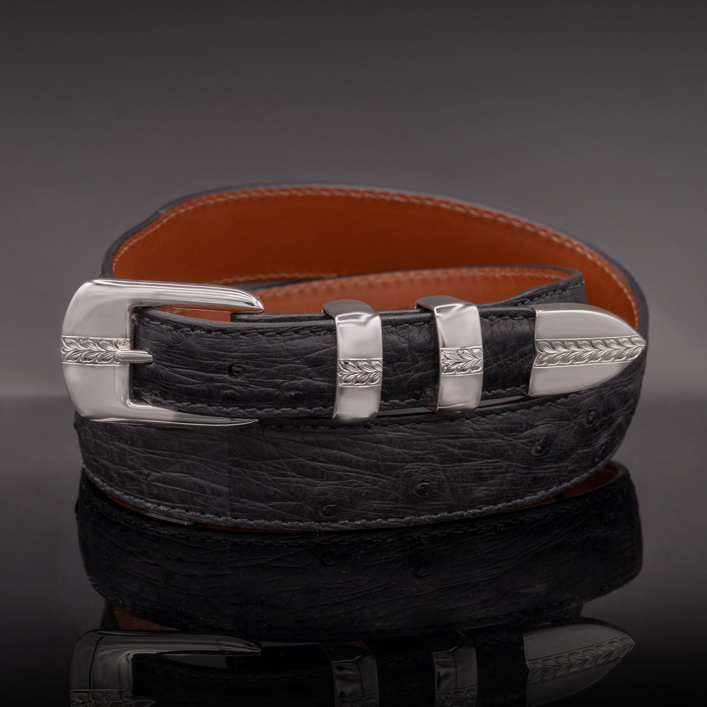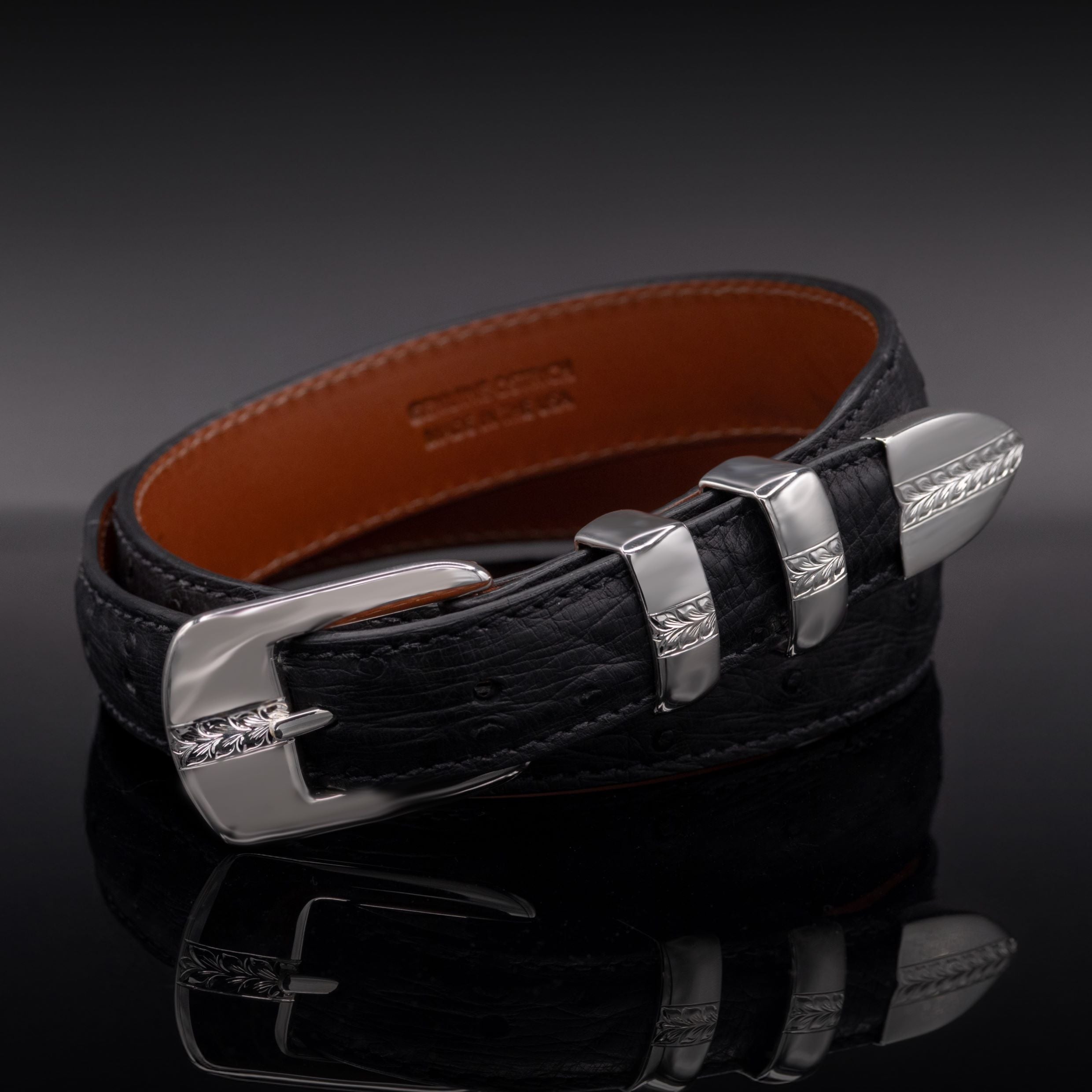 A clean, modern design with just the right touch of detail. This 1" sterling silver buckle set features smooth, polished surfaces accented by hand-engraved leaf patterns across the buckle, keepers, and tip. Balanced and refined, it’s a versatile piece that transitions effortlessly from everyday wear to dress occasions.