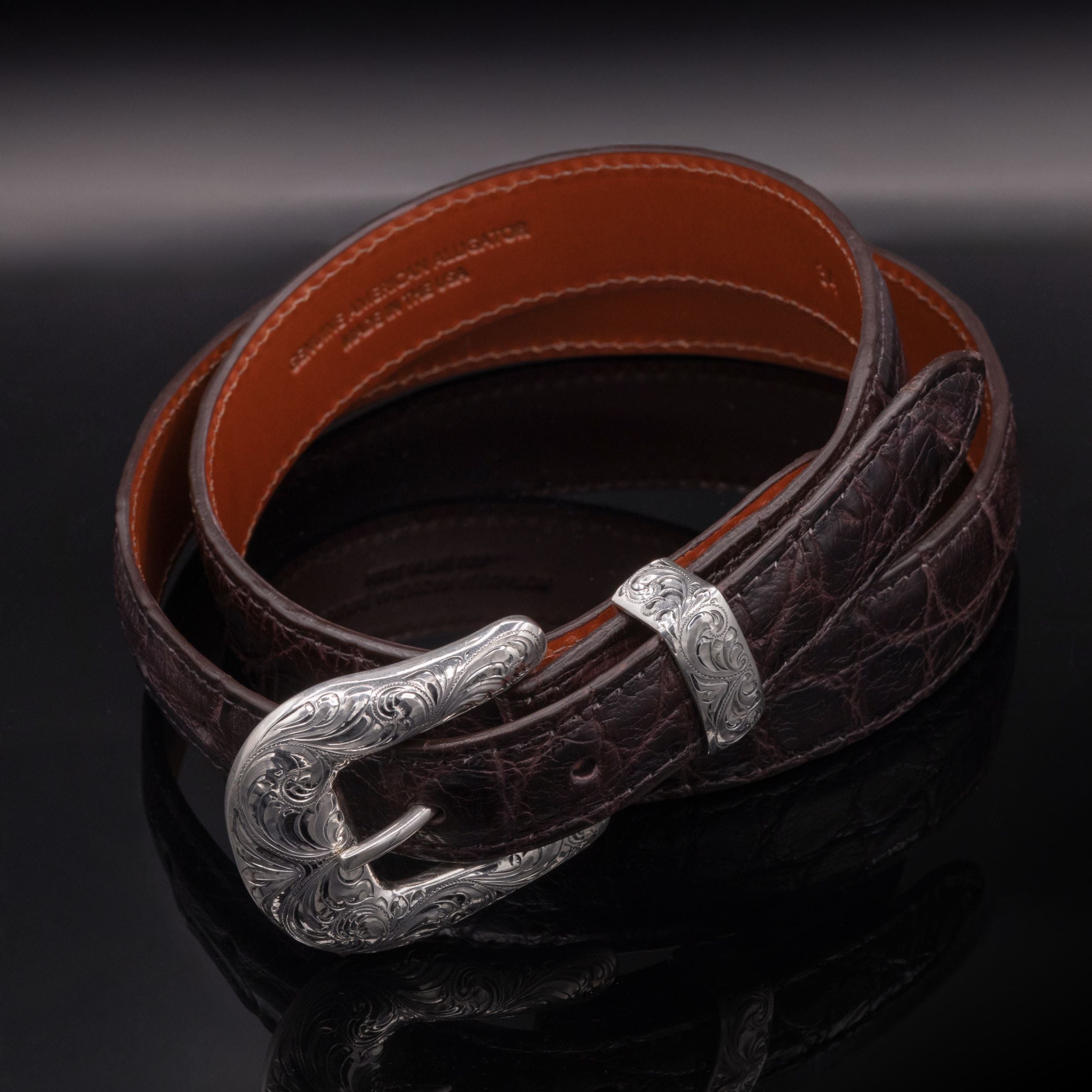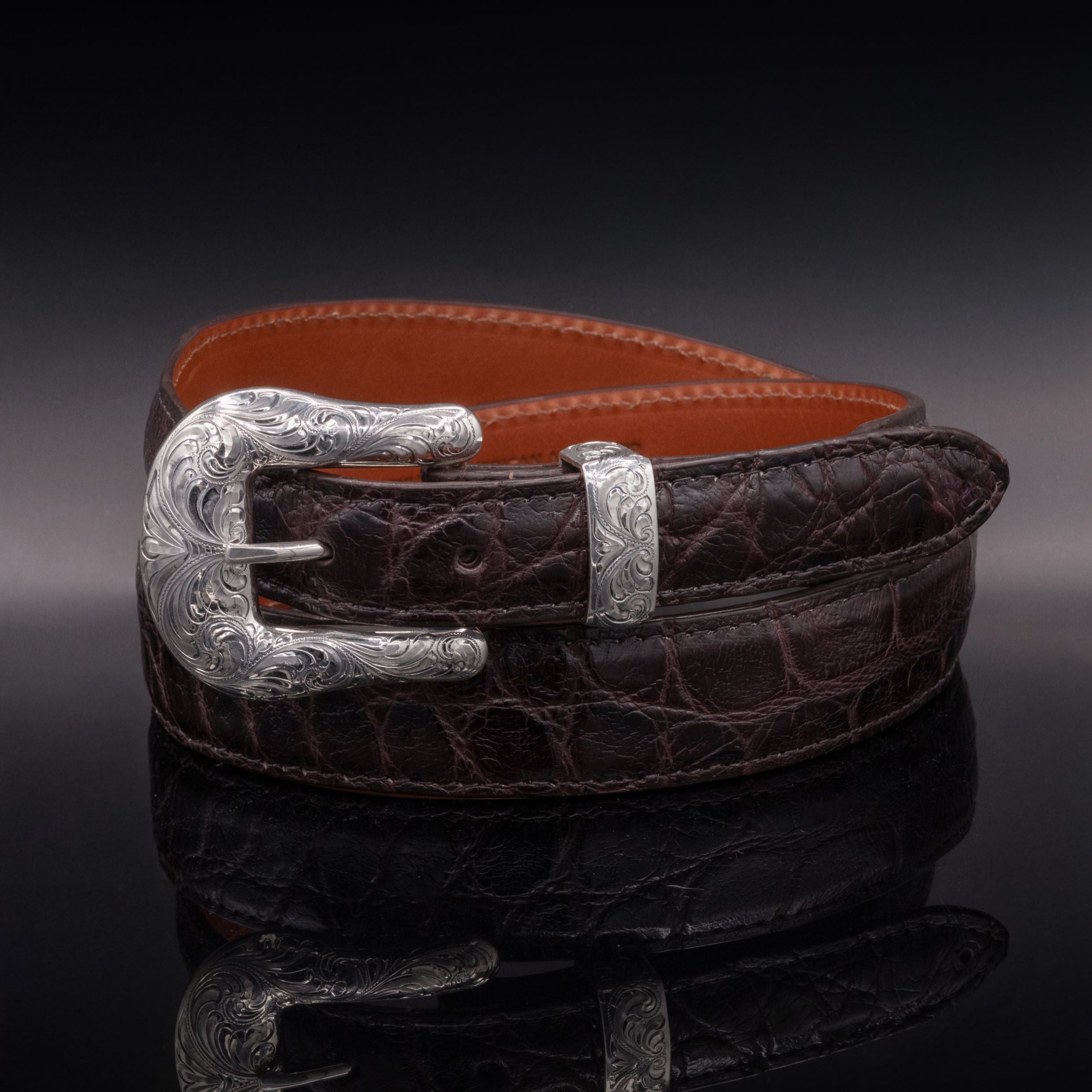 This 2-piece buckle set is handcrafted in solid sterling silver, featuring a flared buckle shape and domed keeper—fully hand-engraved with no added accents for a clean, traditional Western look.