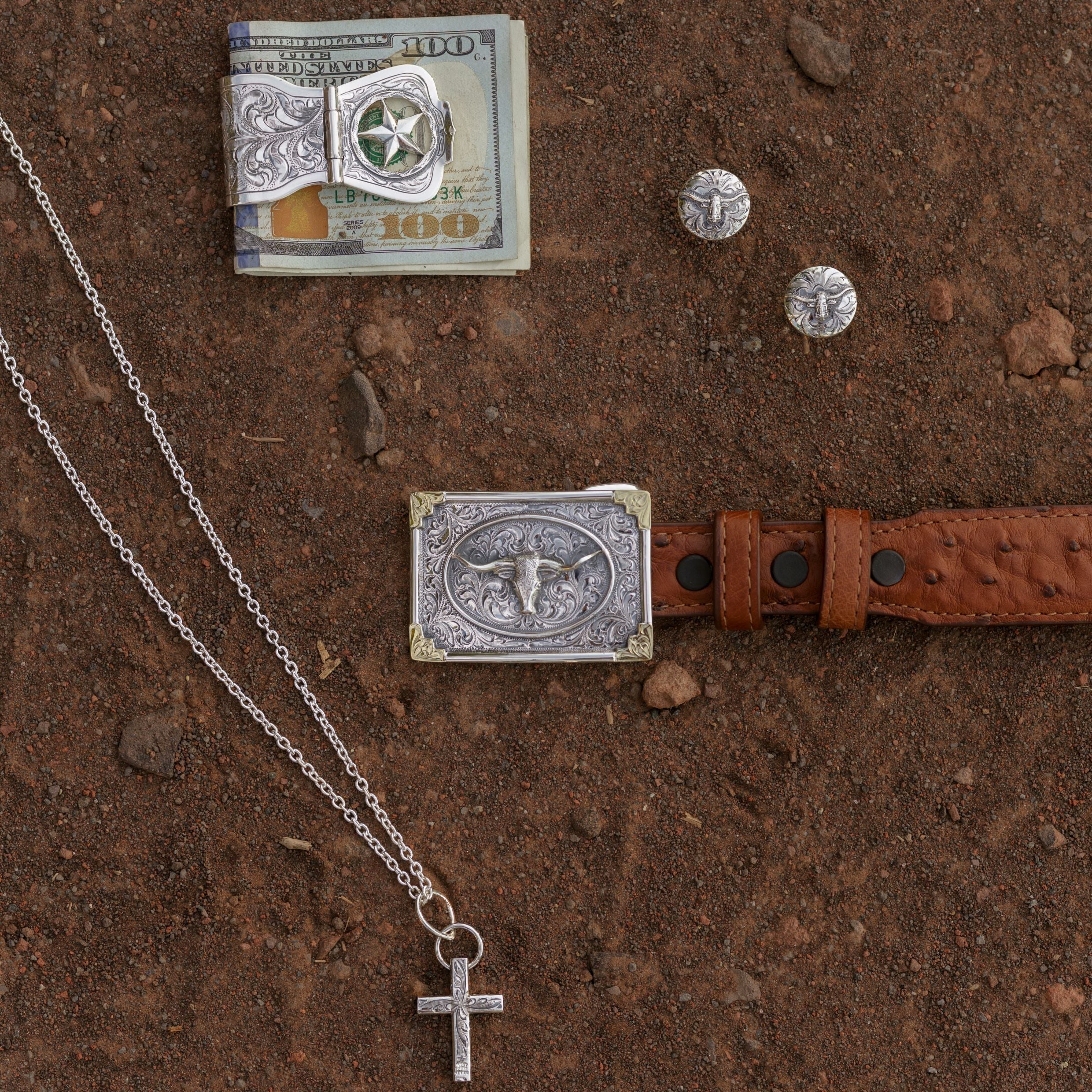 A bold take on a classic, this sterling silver buckle features a raised longhorn center framed by hand-engraved scrollwork. Each corner is accented with 14 karat gold for a refined contrast. Built with a smooth edge and detailed by hand, this piece is made to stand out—and last a lifetime.