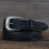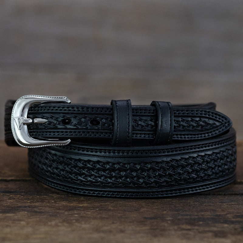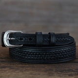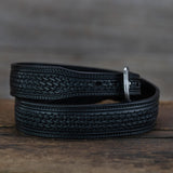 Made from American saddle leather, this belt features a deep black finish with a fully hand-tooled basket weave pattern. It is lined in premium top-grain leather for durability and finished with fine stitching and hand-rubbed edges.