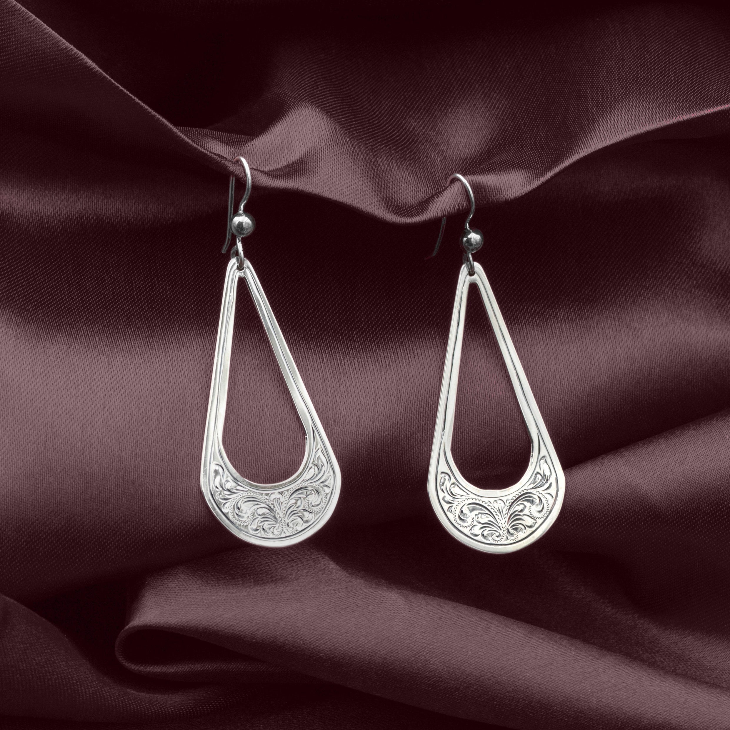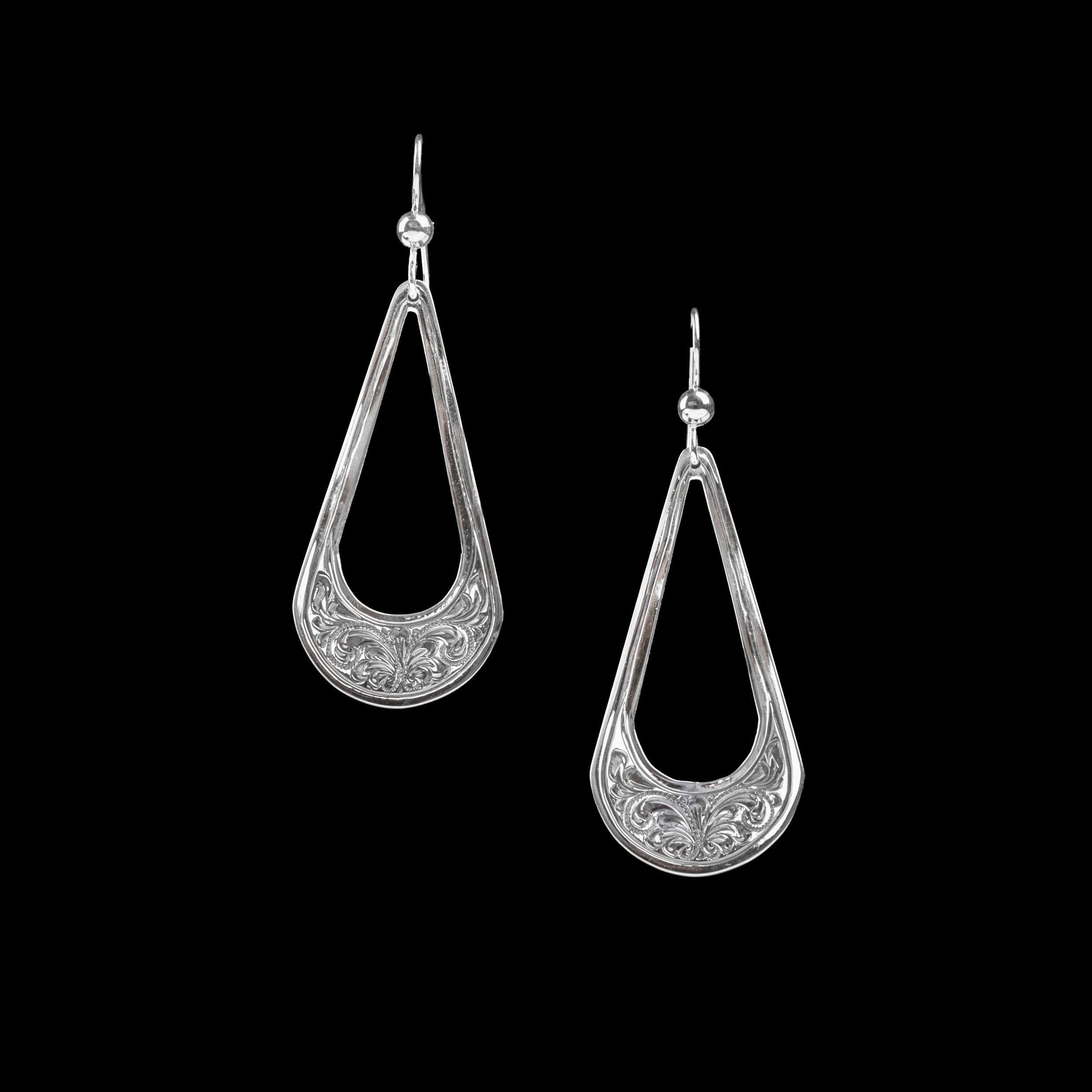 A 2" open-center teardrop silhouette held by sterling silver French hooks, these earrings are accented with hand engraving and a polished edge. They offer a refined, lightweight look with classic Western character.